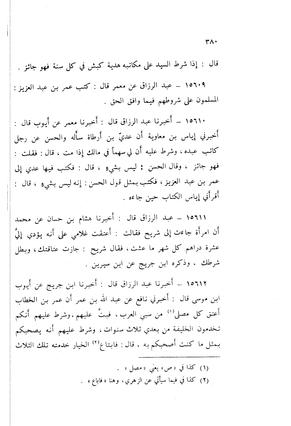 15612 - عَبْدُ الرَّزَّاقِ قَالَ: أَخْبَرَنَا ابْنُ جُرَيْجٍ، عَنْ أَيُّوبَ بْنِ مُوسَى قَالَ: أَخْبَرَنِي نَافِعٌ، عَنْ عَبْدِ اللَّهِ بْنِ عُمَرَ، «أَنَّ عُمَرَ بْنَ الْخَطَّابِ §أَعْتَقَ كُلَّ مُصَلٍّى مِنْ سَبْيِ الْعَرَبِ، فَبَتَّ عَلَيْهِمْ وَشَرَطَ عَلَيْهِمْ أَنَّكُمْ تَخْدُمُونَ الْخَلِيفَةَ مِنْ بَعْدِي ثَلَاثَ سَنَوَاتٍ، وَشَرَطَ عَلَيْهِمْ أَنَّهُ يَصْحَبُكُمْ بِمِثْلِ مَا كُنْتُ أَصْحَبُكُمْ بِهِ» قَالَ: فَابْتَاعَ الْخِيَارَ خِدْمَتُهُ تِلْكَ الثَّلَاثِ سَنَوَاتٍ مِنْ عُثْمَانَ بِأَبِي فَرْوَةَ، وَخَلَّى عُثْمَانُ سَبِيلَ الْخِيَارِ، فَانْطَلَقَ وَقَبَضَ عُثْمَانُ أَبَا فَرْوَةَ