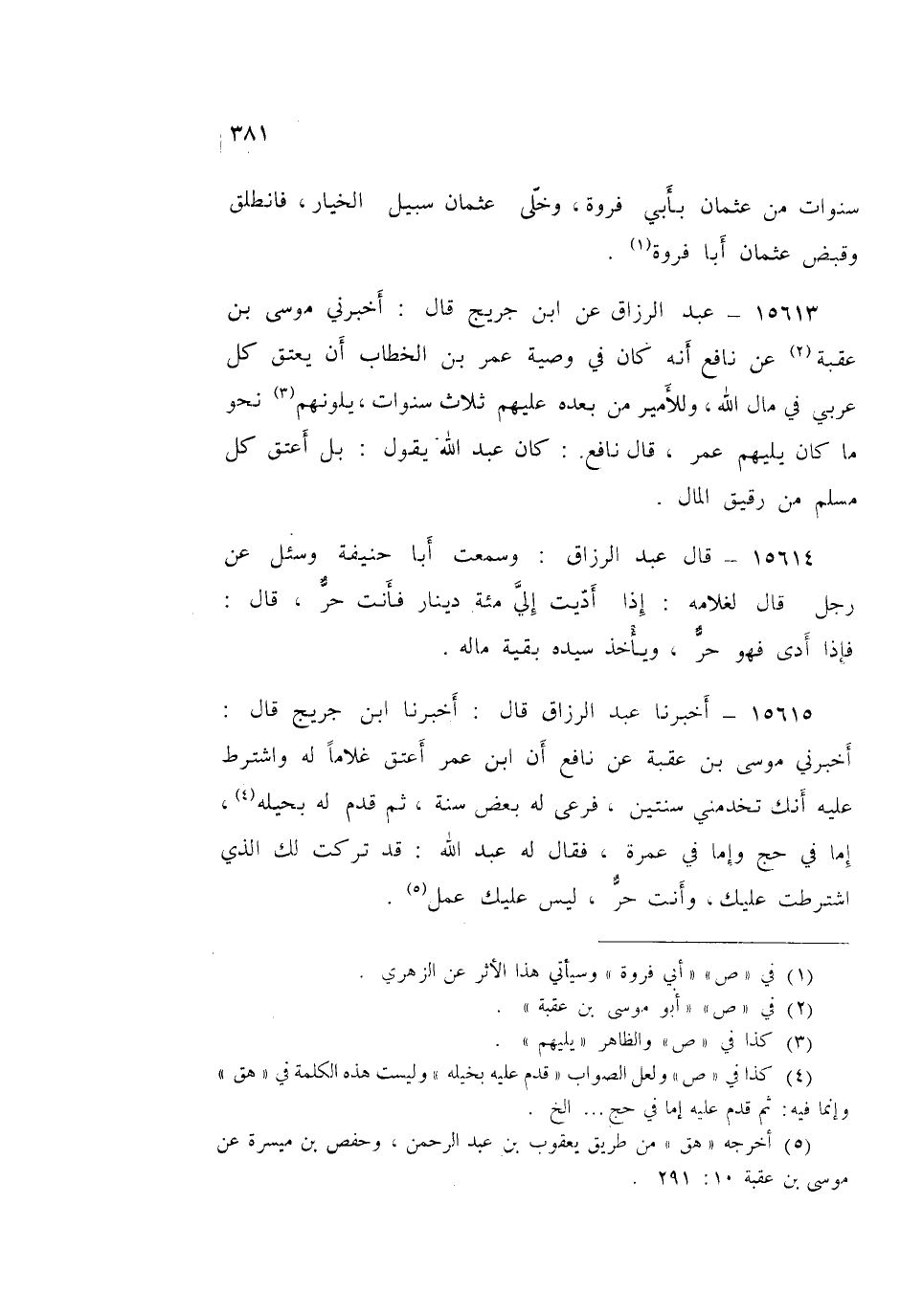 15615 - عَبْدُ الرَّزَّاقِ قَالَ: أَخْبَرَنَا ابْنُ جُرَيْجٍ قَالَ: أَخْبَرَنِي مُوسَى بْنُ عُقْبَةَ، عَنْ نَافِعٍ، أَنَّ ابْنَ عُمَرَ §أَعْتَقَ غُلَامًا لَهُ، وَاشْتَرَطَ عَلَيْهِ أَنَّكَ تَخْدُمُنِي سَنَتَيْنِ، فَرَعَى لَهُ بَعْضَ سَنَةٍ، ثُمَّ قَدِمَ لَهُ بِخَيلِهِ، إِمَّا فِي حَجٍّ وَإِمَّا فِي عُمْرَةٍ، فَقَالَ لَهُ عَبْدُ اللَّهِ: «قَدْ تَرَكْتُ لَكَ الَّذِي اشْتَرَطْتُ عَلَيْكَ، وَأَنْتَ حُرٌّ لَيْسَ عَلَيْكَ عَمَلٌ»