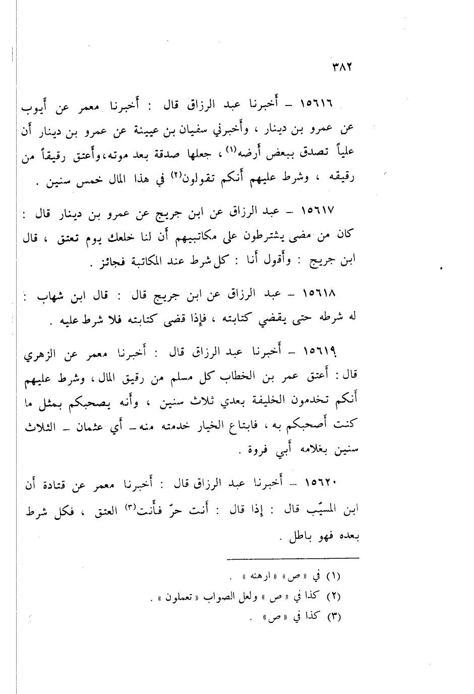15619 - عَبْدُ الرَّزَّاقِ قَالَ: أَخْبَرَنَا مَعْمَرٌ، عَنِ الزُّهْرِيِّ قَالَ: «§أَعْتَقَ عُمَرُ بْنُ الْخَطَّابِ كُلَّ مُسْلِمٍ مِنْ رَقِيقِ الْمَالِ، وَشَرَطَ عَلَيْهِمْ أَنَّكُمْ تَخْدُمُونَ الْخَلِيفَةَ بَعْدِي ثَلَاثَ سِنِينَ، وَأَنَّهُ يَصْحَبُكُمْ بِمِثْلِ مَا كُنْتُ أَصْحَبُكُمْ بِهِ، فَابْتَاعَ الْخِيَارَ خَدَمَتُهُ مِنْهُ - أَيْ عُثْمَانَ - الثَّلَاثَ سِنِينَ بِغُلَامِهِ أَبِي فَرْوَةَ»