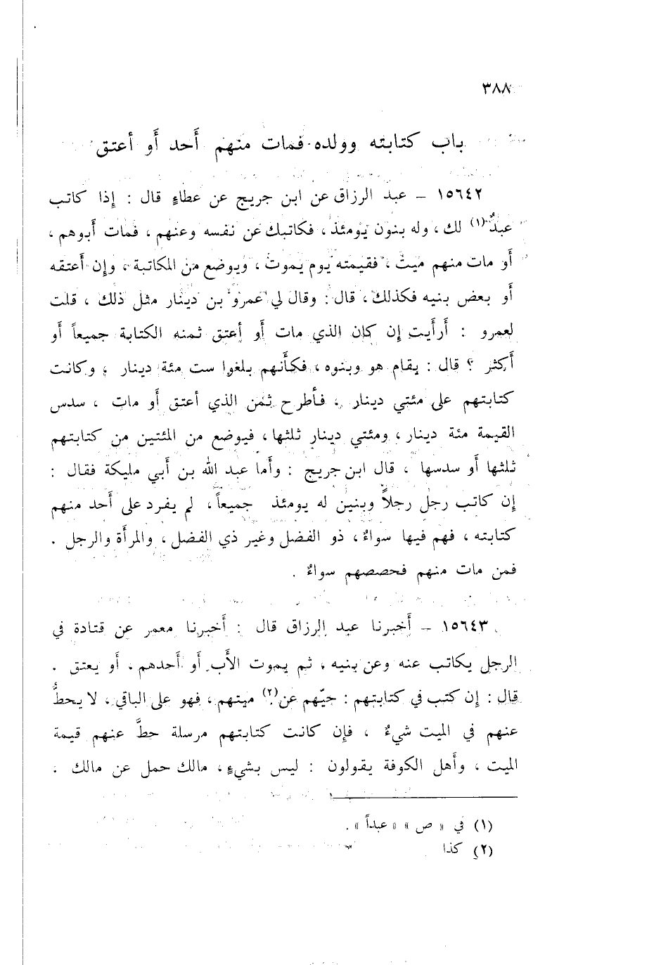 15642 - عَنِ ابْنِ جُرَيْجٍ، عَنْ عَطَاءٍ قَالَ: «§إِذَا كَاتَبَ عَبْدٌ لَكَ وَلَهُ بَنُونَ يَوْمَئِذٍ فَكَاتَبَكَ عَنْ نَفْسِهِ وَعَنْهُمْ، فَمَاتَ أَبُوهُمْ أَوْ مَاتَ مِنْهُمْ مَيِّتٌ، فَقِيمَتُهُ يَوْمَ يَمُوتُ وَيُوضَعُ مِنَ الْمُكَاتَبَةِ، وَإِنْ أَعْتَقَهُ أَوْ بَعْضَ بَنِيهِ»، فَكَذَلِكَ قَالَ: وَقَالَ لِي عَمْرُو بْنُ دِينَارٍ مِثْلَ ذَلِكَ، قُلْتُ لِعَمْرٍو: أَرَأَيْتَ إِنْ كَانَ الَّذِي مَاتَ أَوْ أُعْتِقَ ثَمَنُهُ الْكِتَابَةُ جَمِيعًا أَوْ أَكْثَرُ؟ قَالَ: «يُقَامُ هُوَ وَبَنُوهُ فَكَأَنَّهُمْ بَلَغُوا سِتَّ مِائَةِ دِينَارٍ، وَكَانَتْ كِتَابَتُهُمْ عَلَى مِائَتَيْ دِينَارٍ، فَأَطْرَحُ ثَمَنَ الَّذِي أُعْتِقَ أَوْ مَاتَ، سُدُسُ الْقِيمَةِ مِائَةُ دِينَارٍ، وَمِائَتَيْ دِينَارٍ ثُلُثُهَا، فَيُوضَعُ مِنَ الْمِائَتَيْنِ مِنْ كِتَابَتِهِمْ ثُلُثُهَا أَوْ سُدُسُهَا»