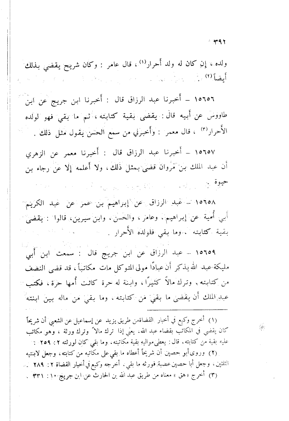 15659 - عَنِ ابْنِ جُرَيْجٍ قَالَ: سَمِعْتُ ابْنَ أَبِي مُلَيْكَةَ عَبْدَ اللَّهِ، يَذْكُرُ أَنَّ عَبَّادًا مَوْلَى الْمُتَوَكِّلِ §مَاتَ مُكَاتَبًا قَدْ قَضَى النِّصْفَ مِنْ كِتَابَتِهِ، وَتَرَكَ مَالًا كَثِيرًا وَابْنَةً لَهُ حُرَّةً، كَانَتْ أُمُّهَا حُرَّةً، فَكَتَبَ عَبْدُ الْمَلِكِ: «أَنْ يُقْضَى مَا بَقِي مِنْ كِتَابَتِهِ وَمَا بَقِي مِنْ مَالِهِ بَيْنَ ابْنَتِهِ وَمَوَالِيهِ»، وَقَالَ لِي عَمْرٌو: «مَا أُرَاهُ إِلَّا لِبِنْتِهِ»