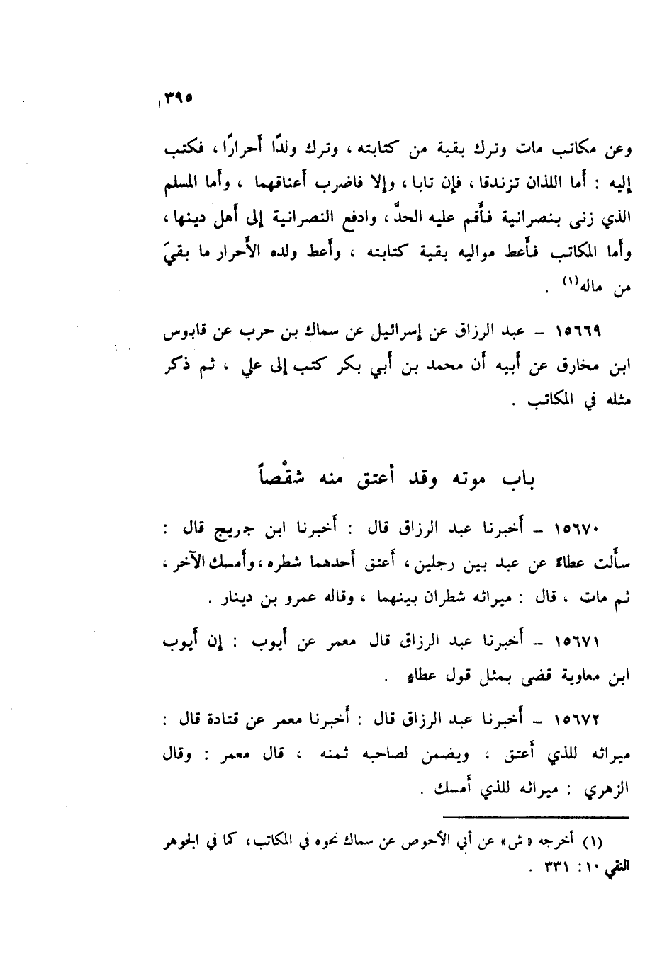 15670 - عَبْدُ الرَّزَّاقِ قَالَ: أَخْبَرَنَا ابْنُ جُرَيْجٍ قَالَ: سَأَلْتُ عَطَاءً عَنْ §عَبْدٍ بَيْنَ رَجُلَيْنِ أَعْتَقَ أَحَدُهُمَا شَطْرَهُ، وَأَمْسَكَ الْآخَرُ، ثُمَّ مَاتَ قَالَ: «مِيرَاثُهُ شَطْرَانِ بَيْنَهُمَا»، وَقَالَهُ عَمْرُو بْنُ دِينَارٍ، أَخْبَرَنَا