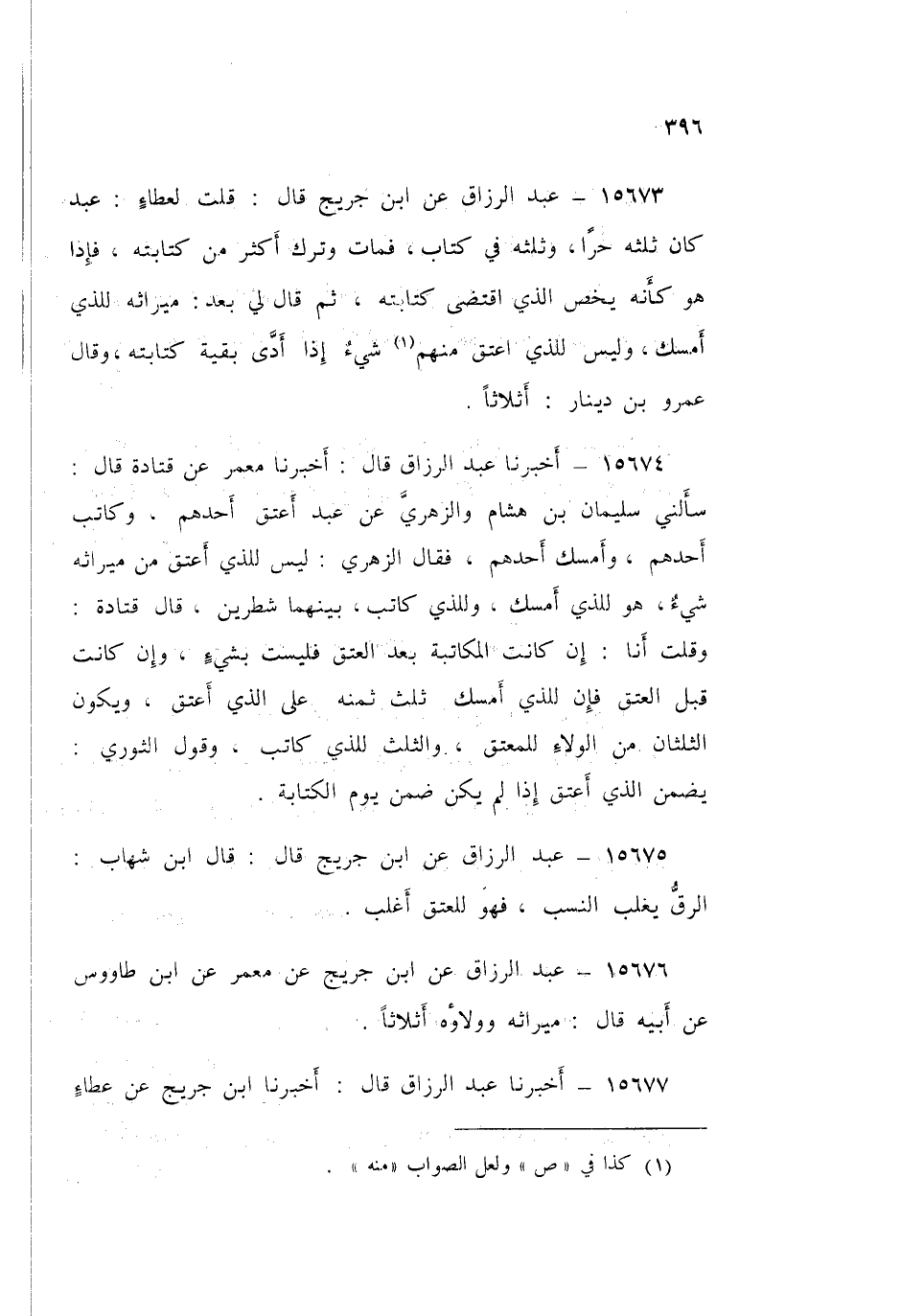 15674 - عَبْدُ الرَّزَّاقِ قَالَ: أَخْبَرَنَا مَعْمَرٌ، عَنْ قَتَادَةَ قَالَ: «سَأَلَنِي سُلَيْمَانُ بْنُ هِشَامٍ، وَالزُّهْرِيَّ عَنْ عَبْدٍ أَعْتَقَ أَحَدُهُمْ وَكَاتَبَ أَحَدُهُمْ وَأَمْسَكَ أَحَدُهُمْ»، فَقَالَ الزُّهْرِيُّ: «§لَيْسَ لِلَّذِي أَعْتَقَ مِنْ مِيرَاثِهِ شَيْءٌ، هُوَ لِلَّذِي أَمْسَكَ، وَلِلَّذِي كَاتَبَ بَيْنَهُمَا شِطْرَيْنِ»، قَالَ قَتَادَةُ: وَقُلْتُ أَنَا: «إِنْ كَانَتِ الْمُكَاتَبَةُ بَعْدَ الْعِتْقِ فَلَيْسَتْ بِشَيْءٍ، وَإِنْ كَانَتْ قَبْلَ الْعِتْقِ فَإِنَّ لِلَّذِي أَمْسَكَ ثُلُثَ ثَمَنِهِ عَلَى الَّذِي أَعْتَقَ، وَيَكُونُ الثُّلُثَانِ مِنَ الْوَلَاءِ لِلْمُعْتِقِ، وَالثُّلُثُ لِلَّذِي كَاتَبَ»، وَقَوْلُ الثَّوْرِيُّ: «يَضْمَنُ الَّذِي أَعْتَقَ إِذَا لَمْ يَكُنْ ضَمِنَ يَوْمَ الْكِتَابَةِ»