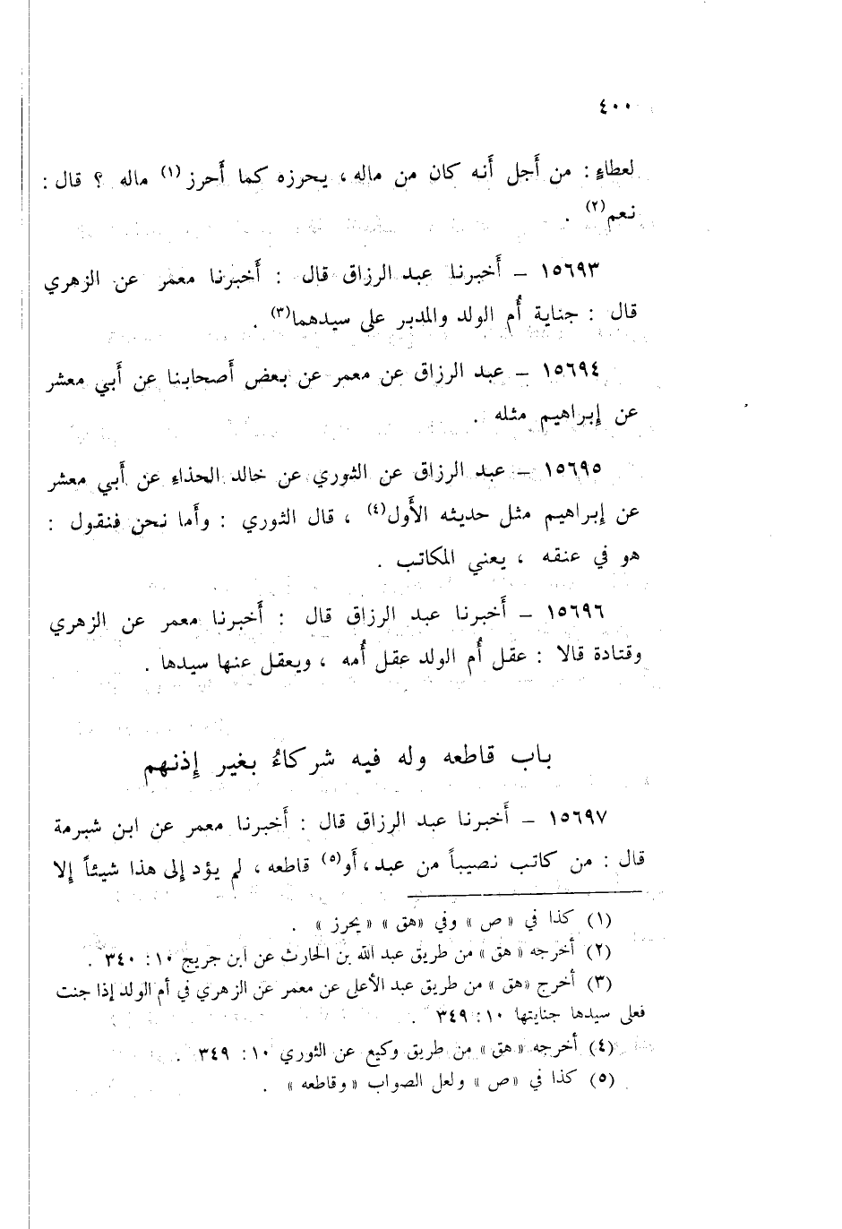 15697 - عَبْدُ الرَّزَّاقِ قَالَ: أَخْبَرَنَا مَعْمَرٌ، عَنِ ابْنِ شُبْرُمَةَ قَالَ: «§مَنْ كَاتَبَ نَصِيبًا مِنْ عَبْدٍ أَوْ قَاطَعَهُ لَمْ يُؤَدِّ إِلَى هَذَا شَيْئًا، إِلَّا أَدَّى إِلَى هَؤُلَاءِ مِثْلَهُ، إِلَّا أَعْتَقَ ضَمِنَهُ الَّذِي كَاتَبَهُ أَوْ أَعْتَقَهُ»
