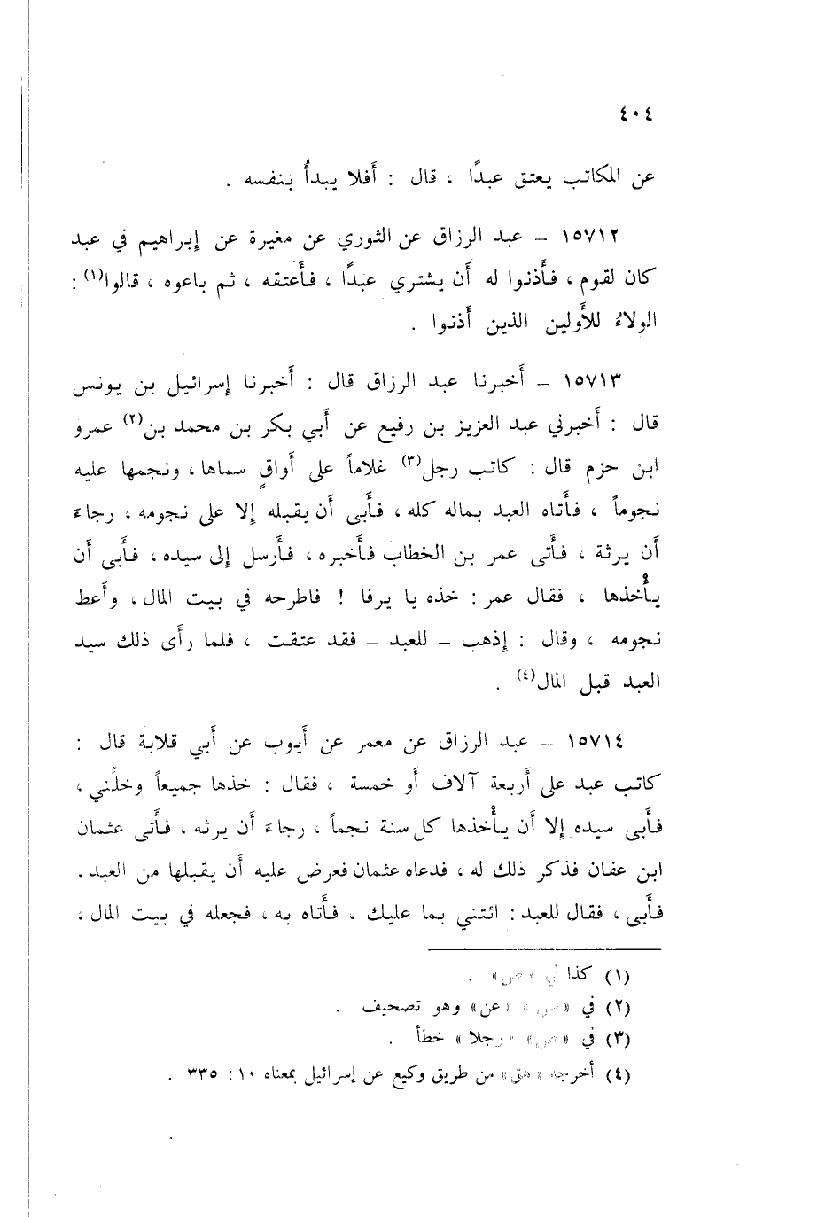 15713 - عَبْدُ الرَّزَّاقِ قَالَ: أَخْبَرَنَا إِسْرَائِيلُ بْنُ يُونُسَ قَالَ: أَخْبَرَنِي عَبْدُ الْعَزِيزِ بْنُ رُفَيْعٍ، عَنْ أَبِي بَكْرِ بْنِ مُحَمَّدِ بْنِ عَمْرِو بْنِ حَزْمٍ قَالَ: كَاتَبَ رَجُلٌ غُلَامًا عَلَى أَوَاقٍ سَمَّاهَا، وَنَجَّمَهَا عَلَيْهِ نُجُومًا، فَأَتَاهُ الْعَبْدُ بِمَالِهِ كُلِّهِ، فَأَبَى أَنْ يَقْبَلَهُ إِلَّا عَلَى نُجُومِهِ رَجَاءَ أَنْ يَرِثَهُ، فَأَتَى عُمَرَ بْنَ الْخَطَّابِ، فَأَخْبَرَهُ، فَأَرْسَلَ إِلَى سَيِّدِهِ فَأَبَى أَنْ يَأْخُذَهَا، فَقَالَ عُمَرُ: «خُذْهُ يَا يَرْفَا، §فَاطْرَحْهُ فِي بَيْتِ الْمَالِ، وَأَعْطِ نُجُومَهُ»، وَقَالَ: «اذْهَبْ - لِلْعَبْدِ - فَقَدْ عُتِقْتَ»، فَلَمَّا رَأَى ذَلِكَ سَيِّدُ الْعَبْدِ قَبِلَ الْمَالَ