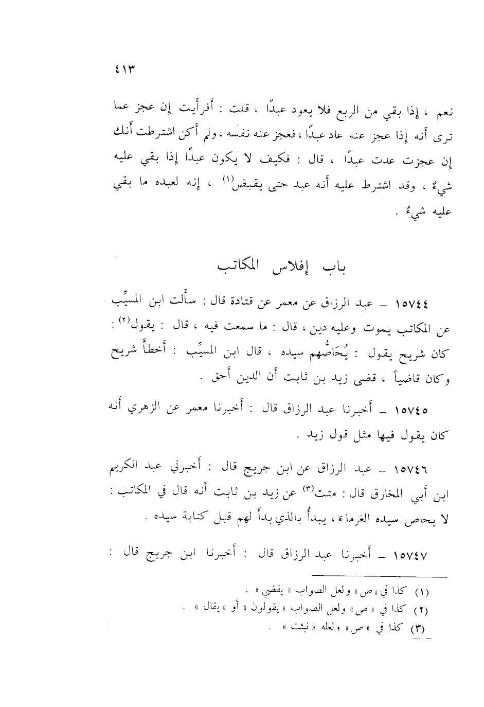 15746 - عَنِ ابْنِ جُرَيْجٍ قَالَ: أَخْبَرَنِي عَبْدُ الْكَرِيمِ بْنُ أَبِي الْمُخَارِقِ قَالَ: نُبِّئْتُ عَنْ زَيْدِ بْنِ ثَابِتٍ أَنَّهُ قَالَ فِي §الْمُكَاتَبِ: «لَا يُحَاصُّ سَيِّدُهُ الْغُرَمَاءَ يَبْدَأُ بِالَّذِي بَدَأَ لَهُمْ قَبْلَ كِتَابَةِ سَيِّدِهِ»