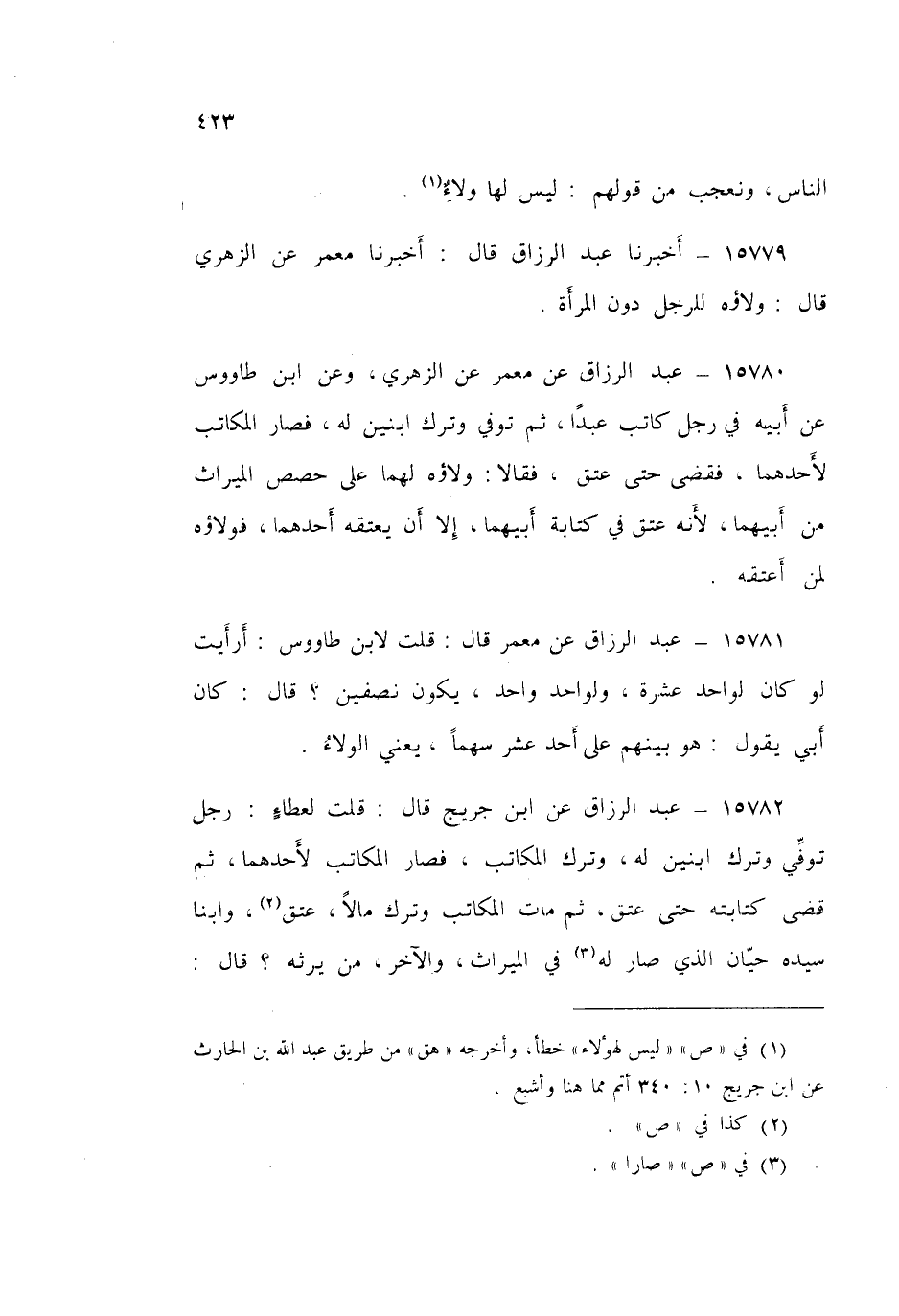 15780 - عَنْ مَعْمَرٍ، عَنِ الزُّهْرِيِّ، وَعَنِ ابْنِ طَاوُسٍ، عَنْ أَبِيهِ، فِي رَجُلٍ كَاتَبَ عَبْدًا، ثُمَّ تُوُفِّيَ وَتَرَكَ ابْنَيْنِ لَهُ، فَصَارَ الْمُكَاتَبُ لِأَحَدِهِمَا، فَقَضَى حَتَّى عُتِقَ فَقَالَا: «§وَلَاؤُهُ لَهُمَا عَلَى حِصَصِ الْمِيرَاثِ مِنْ أَبِيهِمَا، لِأَنَّهُ عُتِقَ فِي كِتَابَةِ أَبِيهِمَا، إِلَّا أَنْ يُعْتِقَهُ أَحَدُهُمَا، فَوَلَاؤُهُ لِمَنْ أَعْتَقَهُ»