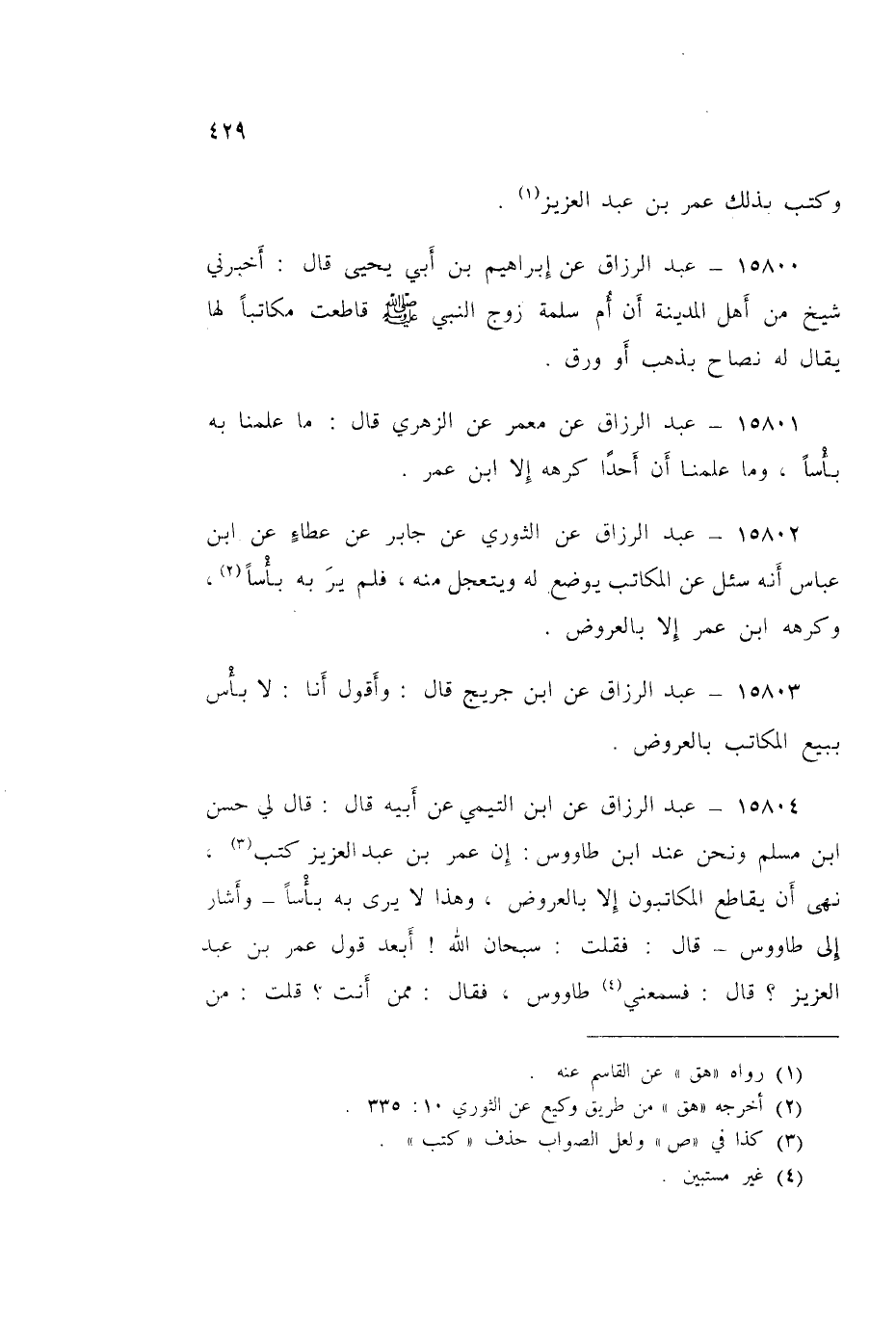 15804 - عَنِ ابْنِ التَّيْمِيِّ، عَنْ أَبِيهِ قَالَ: قَالَ لِي حَسَنُ بْنُ مُسْلِمٍ، وَنَحْنُ عِنْدَ ابْنِ طَاوُسٍ: «إِنَّ عُمَرَ بْنَ عَبْدِ الْعَزِيزِ §نَهَى أَنْ يُقَاطَعَ الْمُكَاتَبُونَ إِلَّا بِالْعُرُوضِ» وَهَذَا لَا يَرَى بِهِ بَأْسَا " وَأَشَارَ إِلَى طَاوُسٍ قَالَ: فَقُلْتُ: سُبْحَانَ اللَّهَ أَبْعَدَ قَوْلِ عُمَرَ بْنِ عَبْدِ الْعَزِيزِ؟ قَالَ: فَسَمِعَنِي طَاوُسٌ، فَقَالَ: «مِمَّنْ أَنْتَ؟» قُلْتُ: مِنْ أَهْلِ الْعِرَاقِ قَالَ: «إِنَّكُمْ تَرَوْنَ أَنَّهُ لَيْسَ أَحَدٌ أَكْيَسَ مِنْكُمْ»