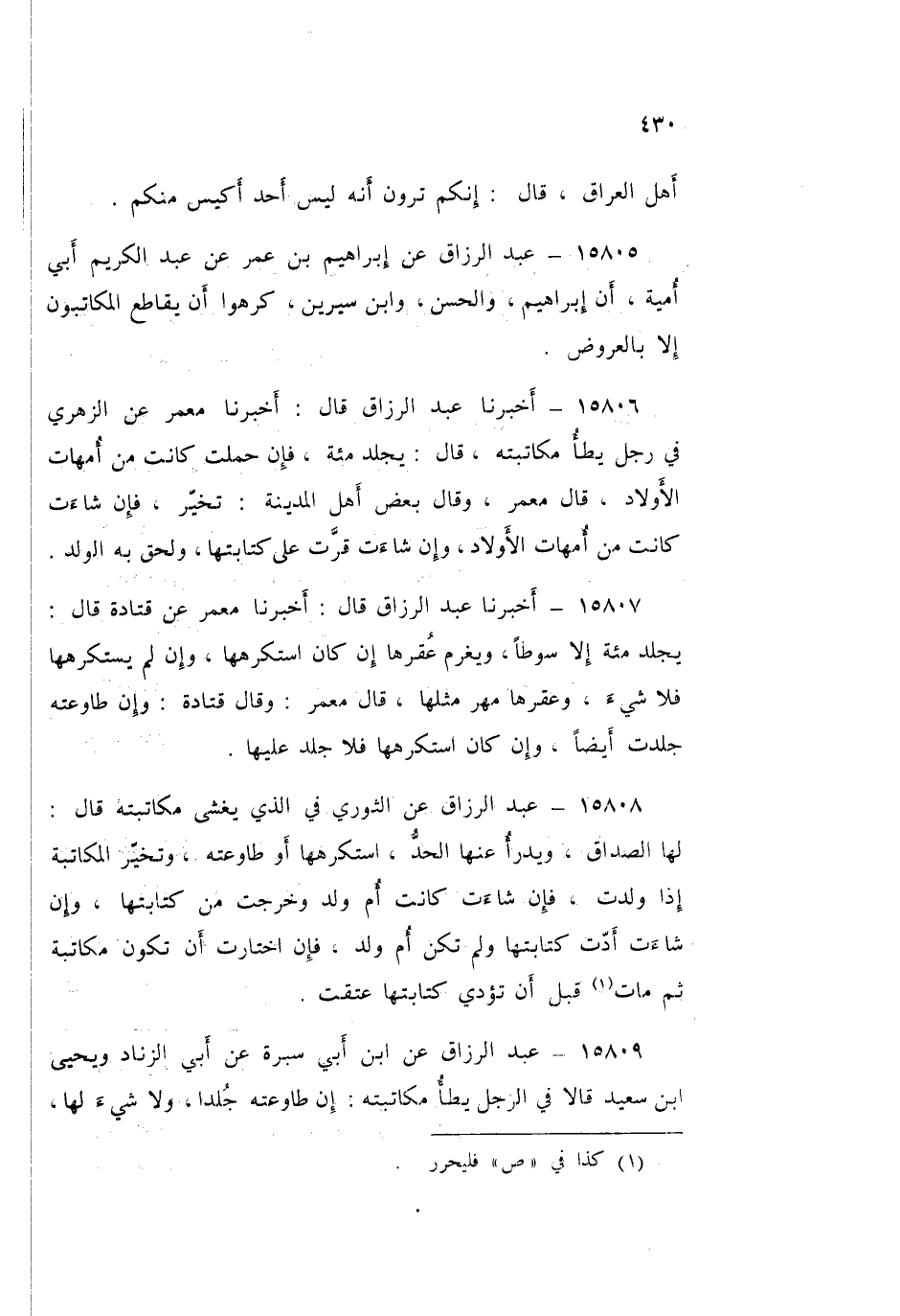 15806 - عَبْدُ الرَّزَّاقِ قَالَ: أَخْبَرَنَا مَعْمَرٌ، عَنِ الزُّهْرِيِّ فِي §رَجُلٍ يَطَأُ مُكَاتَبَتَهُ قَالَ: «يُجْلَدُ مِائَةً، فَإِنْ حَمَلَتْ، كَانَتْ مِنْ أُمَّهَاتِ الْأَوْلَادِ»، قَالَ مَعْمَرٌ: وَقَالَ بَعْضُ أَهْلِ الْمَدِينَةِ: «تُخَيَّرُ، فَإِنْ شَاءَتْ كَانَتْ مِنْ أُمَّهَاتِ الْأَوْلَادِ، وَإِنْ شَاءَتْ قَرَّتْ عَلَى كِتَابَتِهَا، وَلَحِقَ بِهِ الْوَلَدُ»