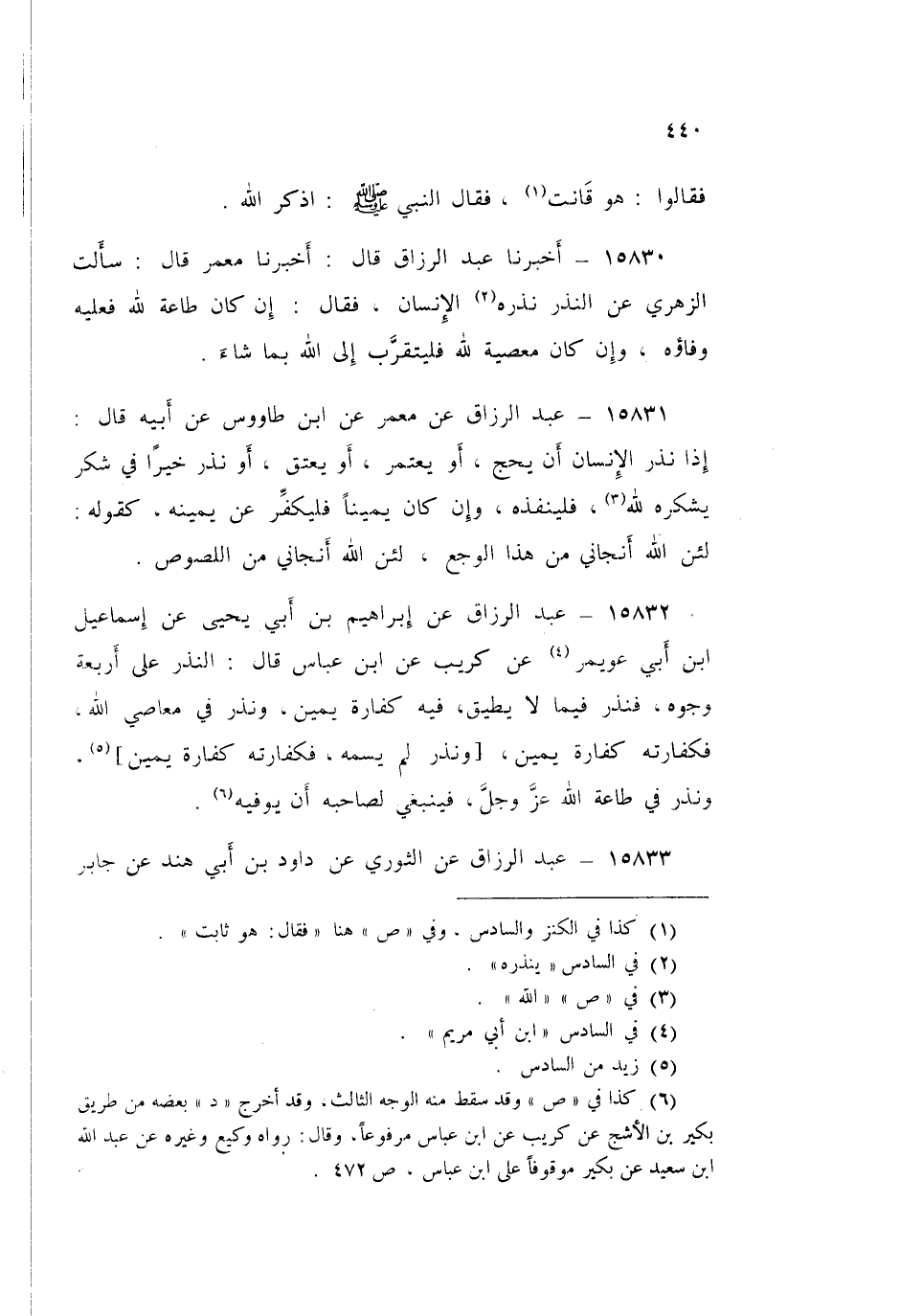 15834 - عَبْدُ الرَّزَّاقِ قَالَ: أَخْبَرَنَا الثَّوْرِيُّ، عَنْ مَنْصُورٍ، عَنْ سَعِيدِ بْنِ جُبَيْرٍ، عَنِ ابْنِ عَبَّاسٍ فِي النَّذْرِ وَالْحَرَامِ قَالَ: «إِذَا لَمْ يُسَمِّ شَيْئًا» قَالَ: «§أَغْلَظُ الْيَمِينِ، فَعَلَيْهِ رَقَبَةٌ، أَوْ صِيَامُ شَهْرَيْنِ مُتَتَابِعَيْنِ، أَوْ إِطْعَامُ سِتِّينَ مِسْكِينًا»
