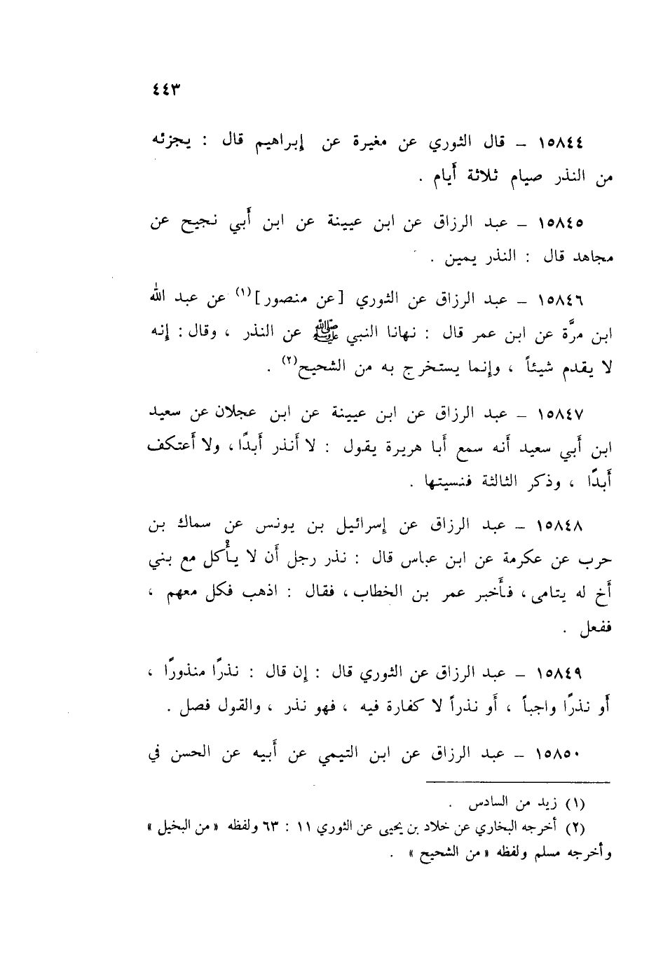 15846 - عَنِ الثَّوْرِيِّ، عَنْ مَنْصُورٍ، عَنْ عَبْدِ اللَّهِ بْنِ مُرَّةَ، عَنِ ابْنِ عُمَرَ قَالَ: §نَهَانَا النَّبِيُّ صَلَّى اللهُ عَلَيْهِ وَسَلَّمَ عَنِ النَّذْرِ، وَقَالَ: «إِنَّهُ لَا يُقَدِّمُ شَيْئًا، وَإِنَّمَا يُسْتَخْرَجُ بِهِ مِنَ الشَّحِيحِ»