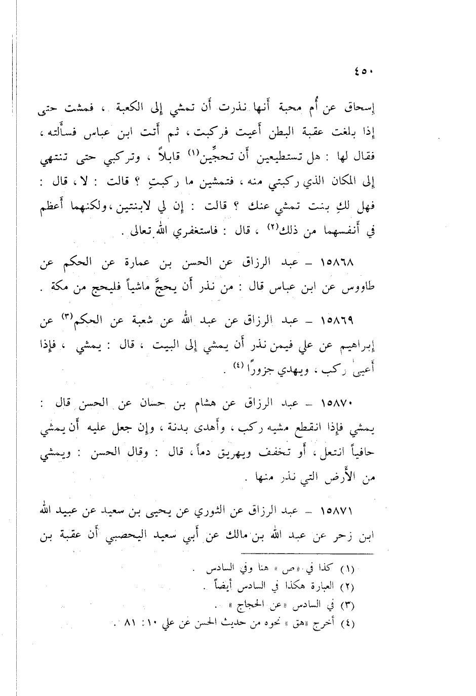 15870 - عَنْ هِشَامِ بْنِ حَسَّانٍ، عَنِ الْحَسَنِ قَالَ: «§يَمْشِي، فَإِذَا انْقَطَعَ مَشْيُهُ رَكِبَ وَأَهْدَى بَدَنَةً، وَإِنْ جَعَلَ عَلَيْهِ أَنْ يَمْشِيَ حَافِيًا، انْتَعَلَ أَوْ تَخَفَّفَ، وَيُهَرِيقُ دَمًا» قَالَ: وَقَالَ الْحَسَنُ: «وَيَمْشِي مِنَ الْأَرْضِ الَّتِي نَذَرَ مِنْهَا»