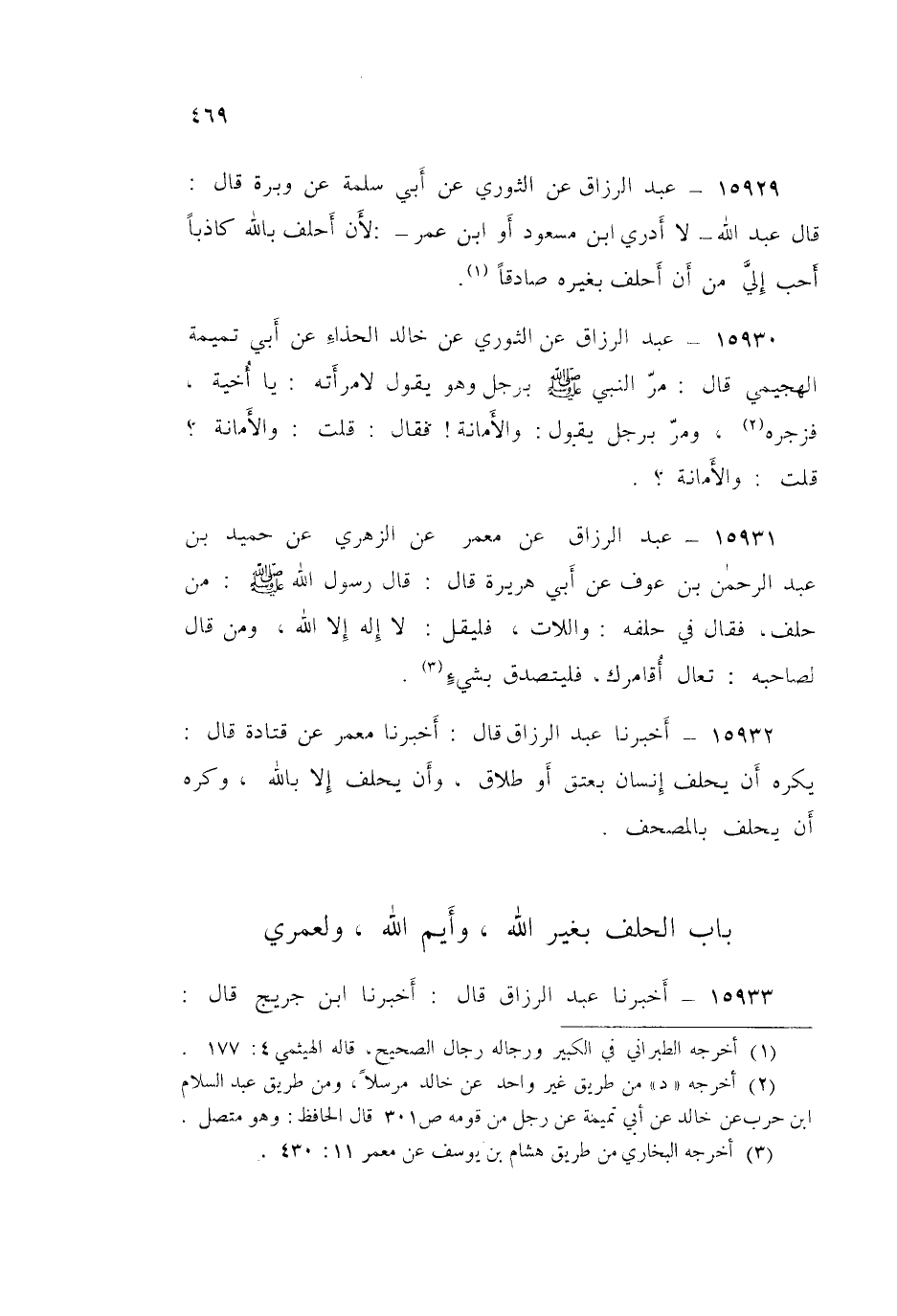 15932 - عَبْدُ الرَّزَّاقِ قَالَ: أَخْبَرَنَا مَعْمَرٌ، عَنْ قَتَادَةَ قَالَ: «§يُكْرَهُ أَنْ يَحْلِفَ إِنْسَانٌ بِعِتْقٍ أَوْ طَلَاقٍ، وَأَنْ يَحْلِفَ إِلَّا بِاللَّهِ وَكُرِهِ أَنْ يُحْلَفَ بِالْمُصْحَفِ»