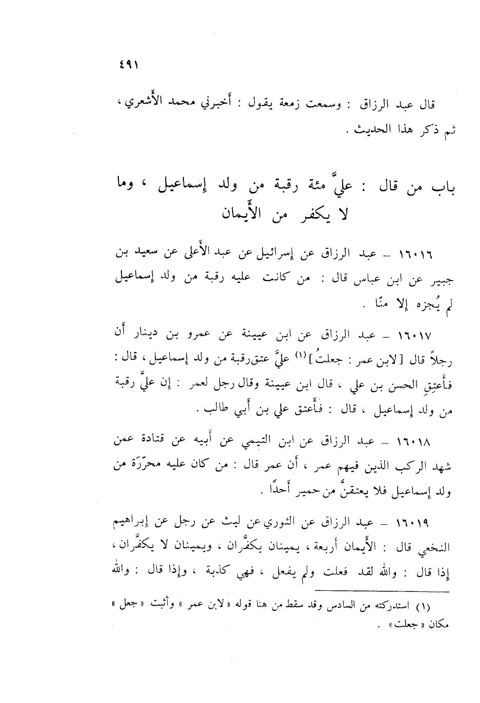 16016 - عَنْ إِسْرَائِيلَ، عَنْ عَبْدِ الْأَعْلَى، عَنْ سَعِيدِ بْنِ جُبَيْرٍ، عَنِ ابْنِ عَبَّاسٍ قَالَ: «§مَنْ كَانَتْ عَلَيْهِ رَقَبَةٌ مِنْ وَلَدِ إِسْمَاعِيلَ لَمْ يُجِزْهُ إِلَّا مِنَّا»