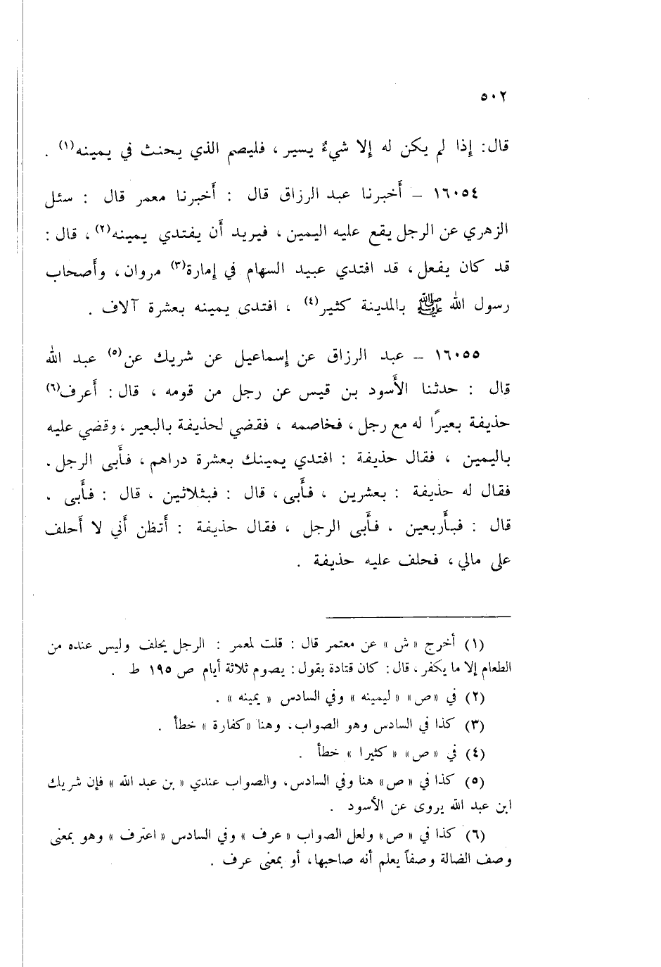 16055 - عَنْ إِسْمَاعِيلَ، عَنْ شَرِيكٍ، عَنْ عَبْدِ اللَّهِ قَالَ: حَدَّثَنَا الْأَسْوَدُ بْنُ قَيْسٍ، عَنْ رَجُلٍ مِنْ قَوْمِهِ قَالَ: أَعْرَفَ حُذَيْفَةُ بَعِيرًا لَهُ مَعَ رَجُلٍ، فَخَاصَمَهُ فَقُضِيَ لِحُذَيْفَةَ بِالْبَعِيرِ، وَقُضِيَ عَلَيْهِ بِالْيَمِينِ، فَقَالَ حُذَيْفَةُ: «§افْتَدِ يَمِينَكَ بِعَشَرَةِ دَرَاهِمَ»، فَأَبَى الرَّجُلُ، فَقَالَ لَهُ حُذَيْفَةُ: «بِعِشْرِينَ؟» فَأَبَى قَالَ: «فَبِثَلَاثِينَ؟» قَالَ: فَأَبَى قَالَ: «فَبِأَرْبَعِينَ؟» فَأَبَى الرَّجُلُ، فَقَالَ حُذَيْفَةُ: «أَتَظُنُّ أَنِّي لَا أَحْلِفُ عَلَى مَالِي؟» فَحَلَفَ عَلَيْهِ حُذَيْفَةُ
