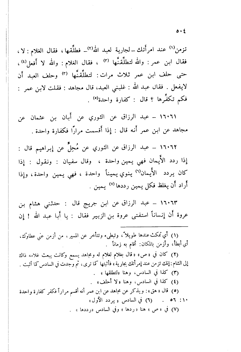 16063 - عَنِ ابْنِ جُرَيْجٍ قَالَ: حَدَّثَنِي هِشَامُ بْنُ عُرْوَةَ، أَنَّ إِنْسَانًا اسْتَفْتَى عُرْوَةَ بْنَ الزُّبَيْرِ، فَقَالَ: يَا أَبَا عَبْدِ اللَّهِ، إِنَّ جَارِيَةٍ لِي قَدْ تَعَرَّضَتْ لِيَ، فَأَقْسَمَتُ أَنْ لَا أَقْرَبَهَا، ثُمَّ تَعَرَّضَتْ لِي، فَأَقْسَمْتُ أَنْ لَا أَقْرَبَهَا، ثُمَّ تَعَرَّضَتْ لِيَ، فَأَقْسَمْتُ أَنْ لَا أَقْرَبَهَا، فَأُكَفِّرُ كَفَّارَةً وَاحِدَةً، أَوْ كَفَّارَاتٍ مُتَفَارِقَاتٍ؟ قَالَ: «§هِيَ كَفَّارَةٌ وَاحِدَةٌ»