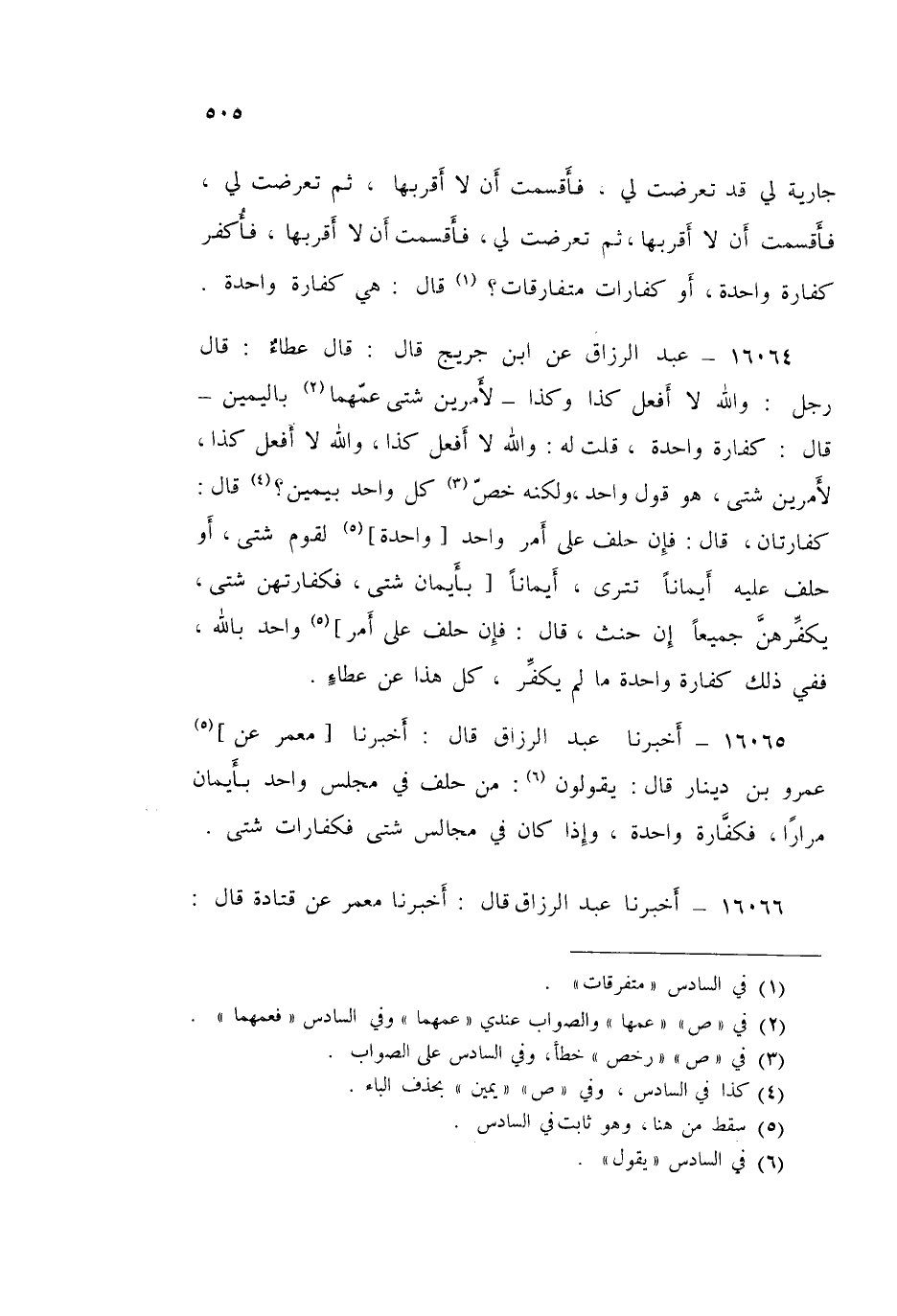 16066 - عَبْدُ الرَّزَّاقِ قَالَ: أَخْبَرَنَا مَعْمَرٌ، عَنْ قَتَادَةَ قَالَ: «§إِذَا حَلَفَ فِي مَجْلِسٍ وَاحِدٍ، فَكَفَّارَةٌ وَاحِدَةٌ، وَإِذَا كَانَ فِي مَجَالِسَ شَتَّى، فَكَفَّارَاتٌ شَتَّى»