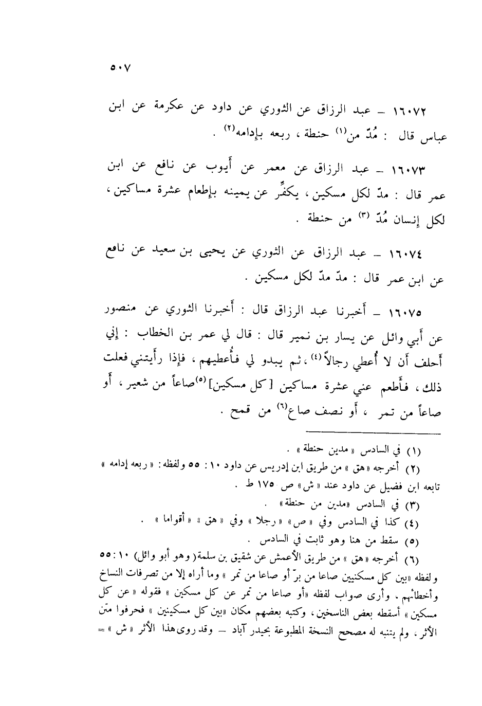 16075 - عَبْدُ الرَّزَّاقِ قَالَ: أَخْبَرَنَا الثَّوْرِيُّ، عَنْ مَنْصُورٍ، عَنْ أَبِي وَائِلٍ، عَنْ يَسَارِ بْنِ نُمَيْرٍ قَالَ: قَالَ لِي عُمَرُ بْنُ الْخَطَّابِ: «إِنِّي §أَحْلِفُ أَنْ لَا أُعْطِي رِجَالًا، ثُمَّ يَبْدُو لِيَ، فَأُعْطِيهِمْ، فَإِذَا رَأَيْتَنِي فَعَلْتُ ذَلِكَ، فَأَطْعِمْ عَنِّي عَشَرَةَ مَسَاكِينَ، كُلَّ مِسْكِينٍ صَاعًا مِنْ شَعِيرٍ، أَوْ صَاعًا مِنْ تَمْرٍ، أَوْ نِصْفَ صَاعٍ مِنْ قَمْحٍ»، عَبْدُ الرَّزَّاقِ،