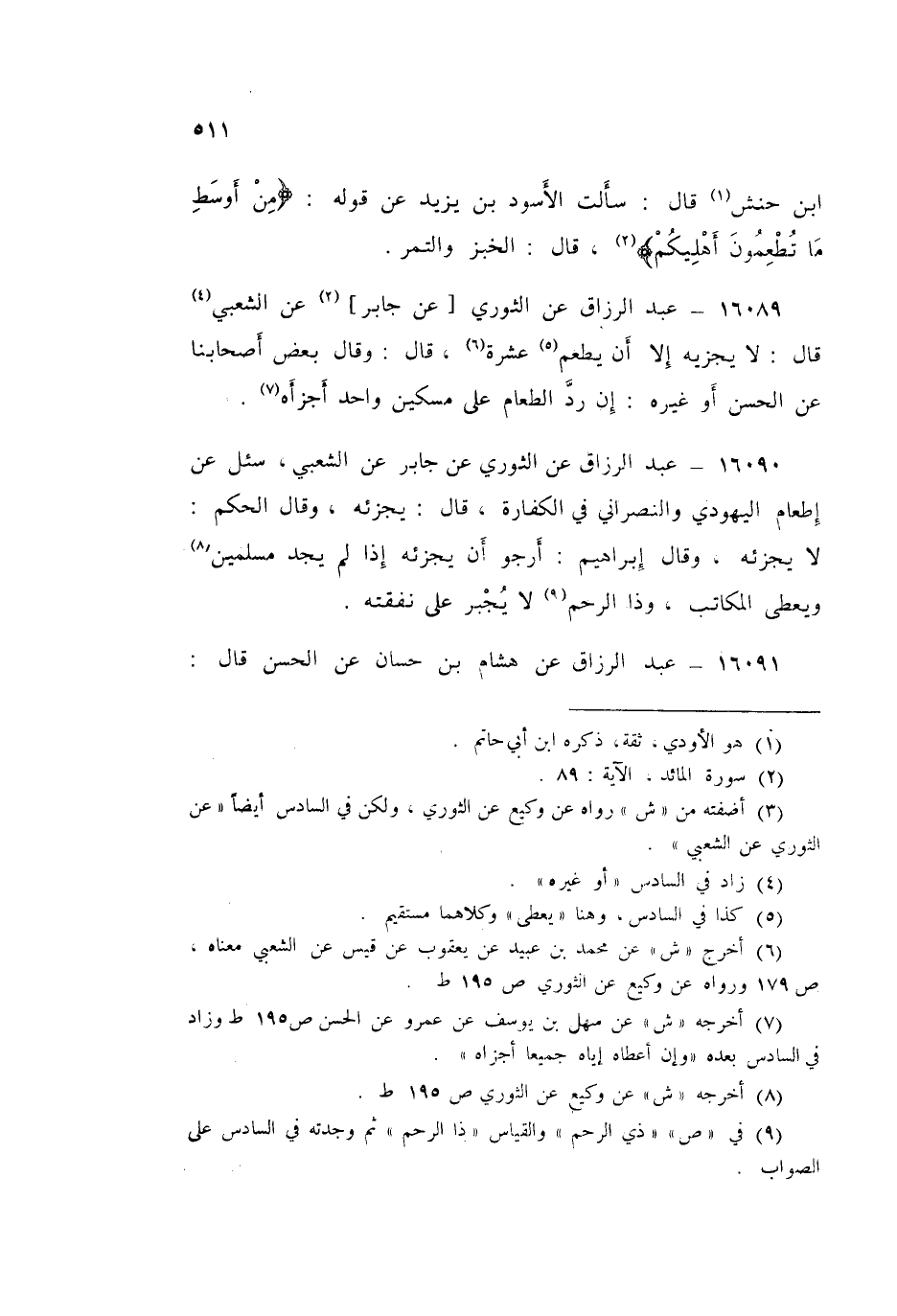 16090 - عَنِ الثَّوْرِيِّ، عَنْ جَابِرٍ، عَنِ الشَّعْبِيِّ، سُئِلَ عَنْ §إِطْعَامِ الْيَهُودِيِّ وَالنَّصْرَانِيِّ فِي الْكَفَّارَةِ؟ قَالَ: «يُجْزِئُهُ»، وَقَالَ الْحَكَمُ: «لَا يُجْزِئُهُ»، وَقَالَ إِبْرَاهِيمُ: «أَرْجُو أَنْ يُجْزِئَهُ إِذَا لَمْ يَجِدْ مُسْلِمِينَ، وَيُعْطِي الْمُكَاتِبَ وَذَا الرَّحِمِ، لَا يُجْبَرُ عَلَى نَفَقَتِهِ»