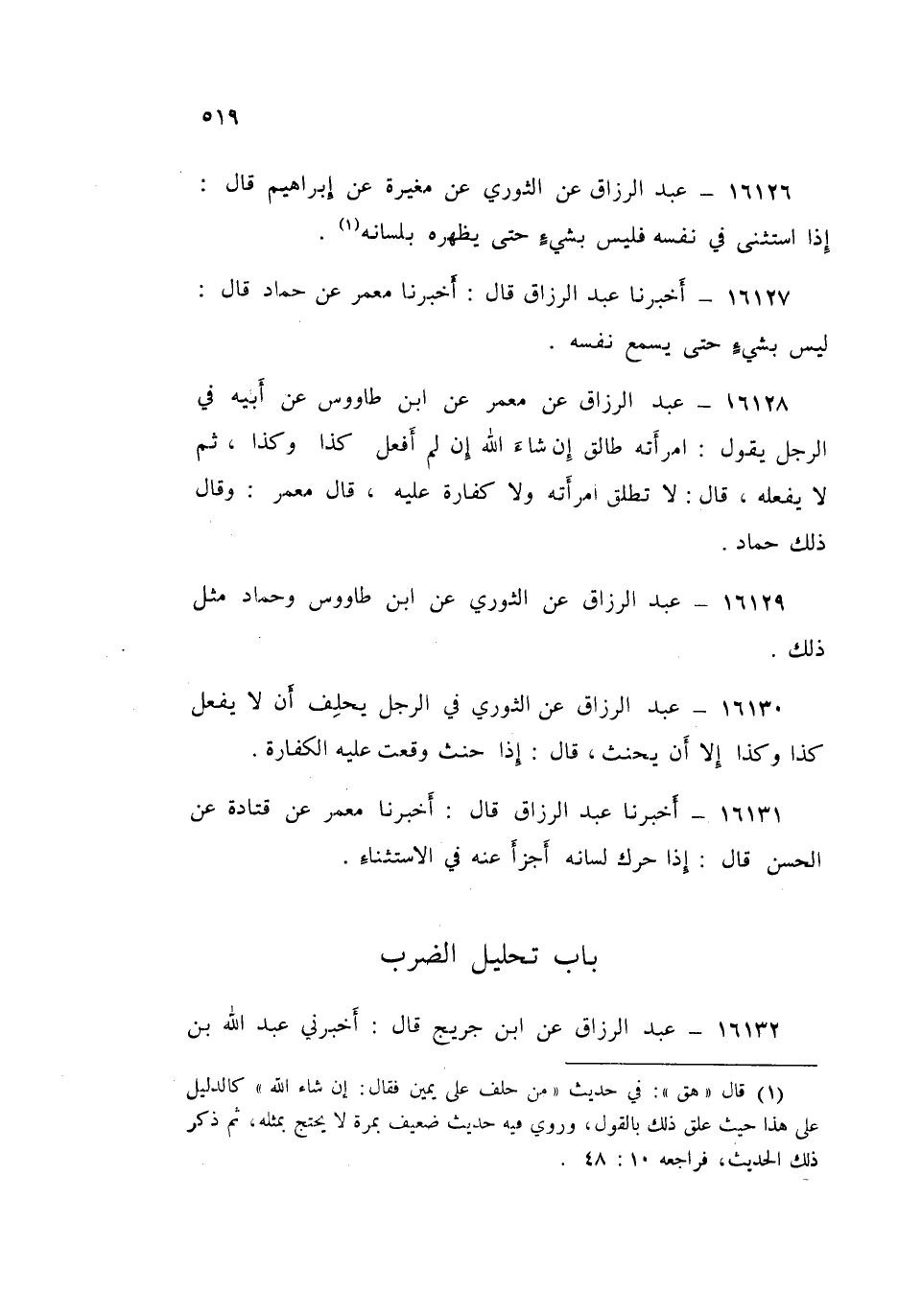16128 - عَنْ مَعْمَرٍ، عَنِ ابْنِ طَاوُسٍ، عَنْ أَبِيهِ، فِي §الرَّجُلِ يَقُولُ: امْرَأَتُهُ طَالِقٌ إِنْ شَاءَ اللَّهُ، إِنْ لَمْ أَفْعَلْ كَذَا وَكَذَا، ثُمَّ لَا يَفْعَلُهُ قَالَ: «لَا تُطَلَّقُ امْرَأَتُهُ، وَلَا كَفَّارَةَ عَلَيْهِ» قَالَ مَعْمَرٌ: وَقَالَ ذَلِكَ حَمَّادٌ، عَبْدُ الرَّزَّاقِ،