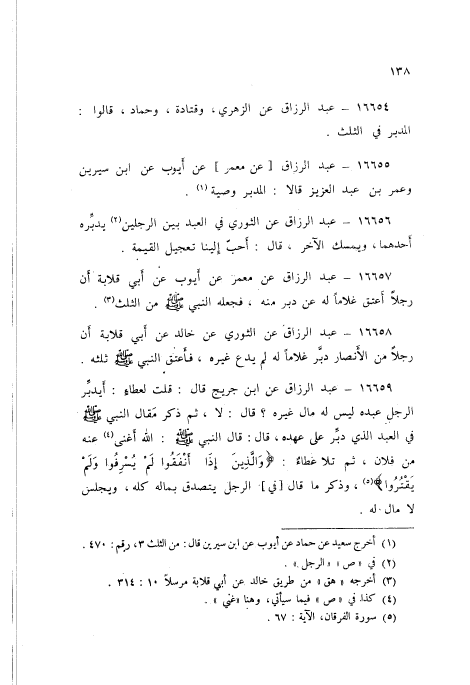 16659 - عَنِ ابْنِ جُرَيْجٍ قَالَ: قُلْتُ لِعَطَاءٍ: أَيُدَبِّرُ الرَّجُلُ عَبْدَهُ لَيْسَ لَهُ مَالٌ غَيْرُهُ قَالَ: لَا ثُمَّ ذَكَرَ مَقَالَ النَّبِيِّ صَلَّى اللهُ عَلَيْهِ وَسَلَّمَ فِي الْعَبْدِ الَّذِي دُبِّرَ عَلَى عَهْدِهِ قَالَ: قَالَ النَّبِيُّ صَلَّى اللهُ عَلَيْهِ وَسَلَّمَ: «§اللَّهُ أَغْنَى عَنْهُ مِنْ فُلَانٍ» ثُمَّ تَلَا عَطَاءٌ {وَالَّذِينَ إِذَا أَنْفَقُوا لَمْ يُسْرِفُوا وَلَمْ يَقْتُرُوا} [الفرقان: 67] وَذَكَرَ مَا قَالَ فِي الرَّجُلِ يَتَصَدَّقُ بِمَالِهِ كُلِّهِ وَيَجْلِسُ لَا مَالَ لَهُ