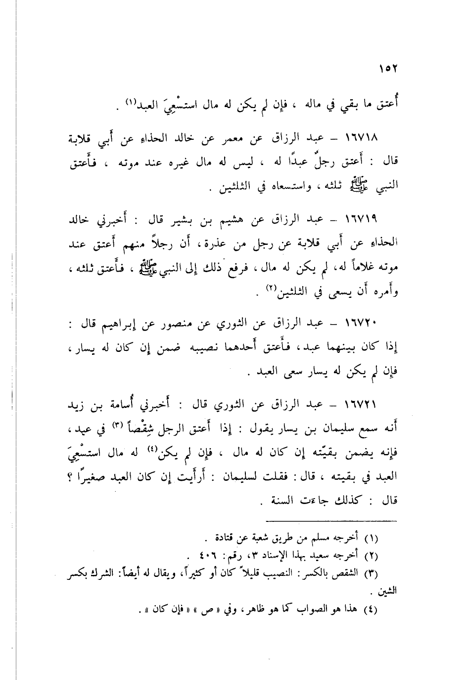 16719 - عَنْ هُشَيْمِ بْنِ بَشِيرٍ قَالَ: أَخْبَرَنِي خَالِدٌ الْحَذَّاءُ، عَنْ أَبِي قِلَابَةَ، عَنْ رَجُلٍ مِنْ عَذْرَةَ أَنَّ رَجُلًا مِنْهُمْ أَعْتَقَ عِنْدَ مَوْتِهِ غُلَامًا لَهُ لَمْ يَكُنْ لَهُ مَالٌ، فَرُفِعَ ذَلِكَ إِلَى النَّبِيِّ صَلَّى اللهُ عَلَيْهِ وَسَلَّمَ «§فَأَعْتَقَ ثُلُثَهُ، وَأَمَرَهُ أَنْ يَسْعَى فِي الثُّلُثَيْنِ»