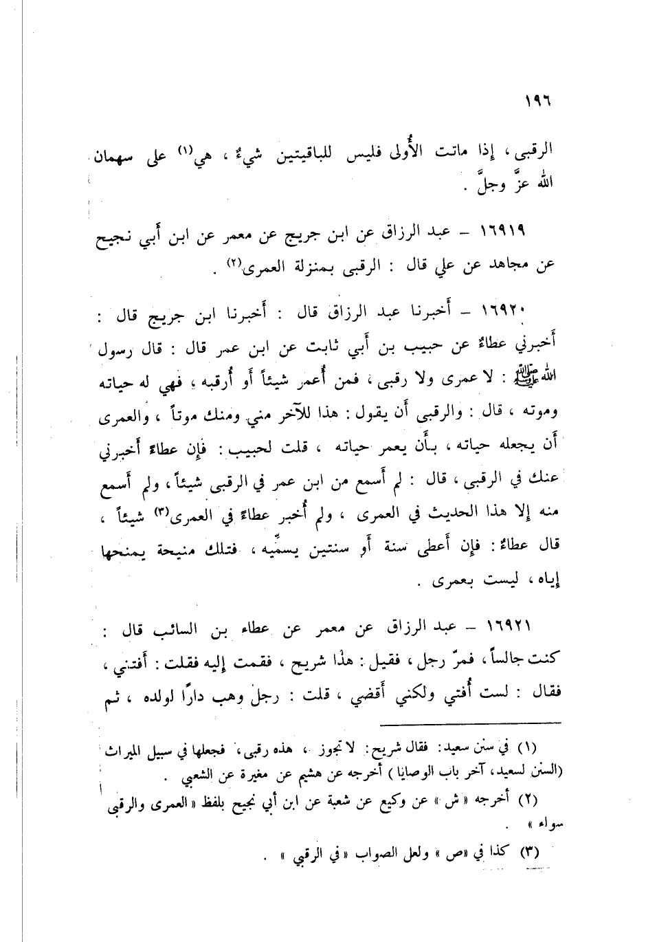16920 - عَبْدُ الرَّزَّاقِ قَالَ: أَخْبَرَنَا ابْنُ جُرَيْجٍ قَالَ: أَخْبَرَنِي عَطَاءٌ، عَنْ حَبِيبِ بْنِ أَبِي ثَابِتٍ، عَنِ ابْنِ عُمَرَ قَالَ: قَالَ رَسُولُ اللَّهِ صَلَّى اللهُ عَلَيْهِ وَسَلَّمَ: «§لَا عُمْرَى، وَلَا رُقْبَى فَمَنْ أُعْمِرَ شَيْئًا أَوْ أُرْقِبَهُ فَهِيَ لَهُ حَيَاتَهُ وَمَوْتَهُ» قَالَ: " وَالرُّقْبَى أَنْ يَقُولَ: هَذَا لِلْآَخِرِ مِنِّي وَمِنْكَ مَوْتًا، وَالْعُمْرَى أَنْ يَجْعَلَهُ حَيَاتَهُ بِأَنْ يُعْمِرَ حَيَاتَهُ " قُلْتُ لِحَبِيبٍ فَإِنَّ عَطَاءً أَخْبَرَنِي عَنْكَ فِي الرُّقْبَى قَالَ: لَمْ أَسْمَعْ مِنِ ابْنِ عُمَرَ فِي الرُّقْبَى شَيْئًا وَلَمْ أَسْمَعْ مِنْهُ إِلَّا هَذَا الْحَدِيثَ فِي الْعُمْرَى وَلَمْ أُخْبِرْ عَطَاءً فِي الْعُمْرَى شَيْئًا، قَالَ عَطَاءٌ: فَإِنْ أَعْطَى سَنَةً أَوْ سَنَتَيْنِ يُسَمِّيهِ فَتِلْكَ مَنِيحَةٌ يَمْنَحُهَا إِيَّاهُ لَيْسَتْ بِعُمْرَى "
