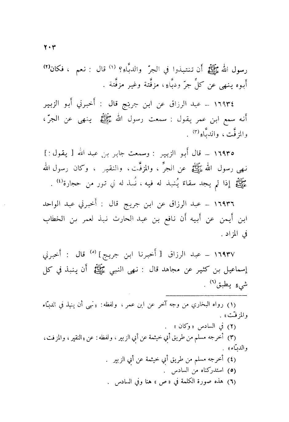 16935 - قَالَ: أَبُو الزُّبَيْرِ وَسَمِعْتُ جَابِرَ بْنَ عَبْدِ اللَّهِ يَقُولُ: «§نَهَى رَسُولُ اللَّهِ صَلَّى اللهُ عَلَيْهِ وَسَلَّمَ عَنِ الْجَرِّ، وَالْمُزَفَّتِ، وَالنَّقِيرِ، وَكَانَ رَسُولُ اللَّهِ صَلَّى اللهُ عَلَيْهِ وَسَلَّمَ إِذَا لَمْ يَجِدْ سِقَاءً يُنْبَذُ لَهُ فِيهِ نُبِذَ لَهُ فِي تَوْرٍ مِنْ حِجَارَةٍ»