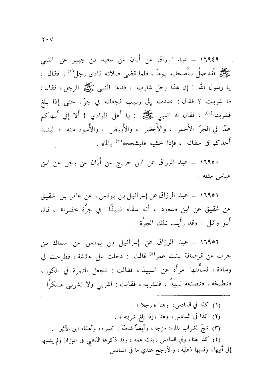 16949 - عَبْدُ الرَّزَّاقِ، عَنْ أَبَانَ، عَنْ سَعِيدِ بْنِ جُبَيْرٍ، عَنِ النَّبِيِّ صَلَّى اللهُ عَلَيْهِ وَسَلَّمَ أَنَّهُ صَلَّى بِأَصْحَابِهِ يَوْمًا، فَلَمَّا قَضَى صَلَاتَهُ نَادَى رَجُلٌ فَقَالَ: يَا رَسُولَ اللَّهِ إنَّ هَذَا رَجُلٌ شَارِبٌ، فَدَعَا النَّبِيُّ صَلَّى اللهُ عَلَيْهِ وَسَلَّمَ الرَّجُلَ فَقَالَ: «مَا شَرِبْتُ؟» فَقَالَ: عَمَدْتُ إِلَى زَبِيبٍ فَجَعَلْتُهُ فِي جَرٍّ حَتَّى إِذَا بَلَغَ فَشَرِبْتُهُ، فَقَالَ لَهُ النَّبِيُّ صَلَّى اللهُ عَلَيْهِ وَسَلَّمَ: «§يَا أَهْلَ الْوَادِي أَلَا إِنِّي أَنْهَاكُمْ عَمَّا فِي الْجَرِّ الْأَحْمَرِ، وَالْأَخْضَرِ، وَالْأَبْيَضِ، وَالْأَسْوَدِ مِنْهُ، لِيُنْبِذْ أَحَدُكُمْ فِي سِقَائِهِ، فَإِذَا خَشِيَهُ فَلْيُشَجِّجْهُ بِالْمَاءِ»، عَبْدُ الرَّزَّاقِ،
