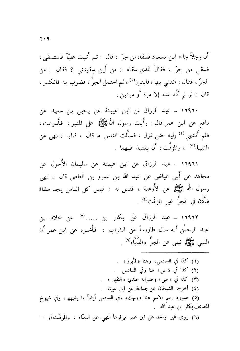 16962 - عَنْ بَكَّارِ بْنِ، عَنْ خَلَّادِ بْنِ عَبْدِ الرَّحْمَنِ، أَنَّهُ سَأَلَ طَاوُسًا عَنِ الشَّرَابِ فَأَخْبَرَهُ عَنِ ابْنِ عُمَرَ أَنَّ النَّبِيَّ صَلَّى اللهُ عَلَيْهِ وَسَلَّمَ §نَهَى عَنِ الْجَرِّ وَالدُّبَّاءِ "