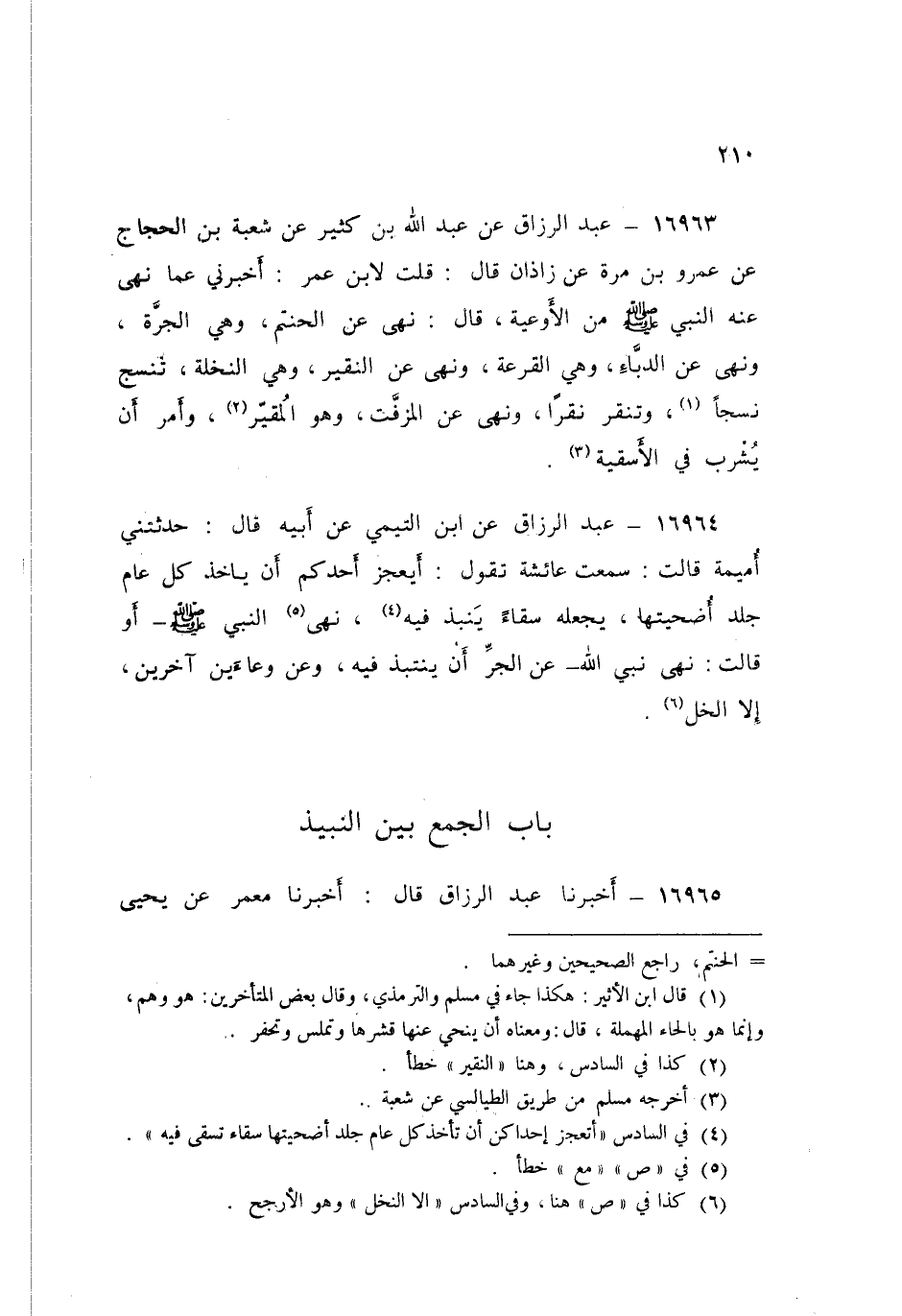 16966 - عَبْدُ الرَّزَّاقِ قَالَ: أَخْبَرَنَا ابْنُ جُرَيْجٍ قَالَ: قَالَ لِي عَطَاءٌ: سَمِعْتُ جَابِرَ بْنَ عَبْدِ اللَّهِ يَقُولُ: «§لَا تَجْمَعُوا بَيْنَ الرُّطَبِ، وَالْبُسْرِ، وَبَيْنَ التَّمْرِ، وَالزَّبِيبِ نَبِيذًا»، عَبْدُ الرَّزَّاقِ،