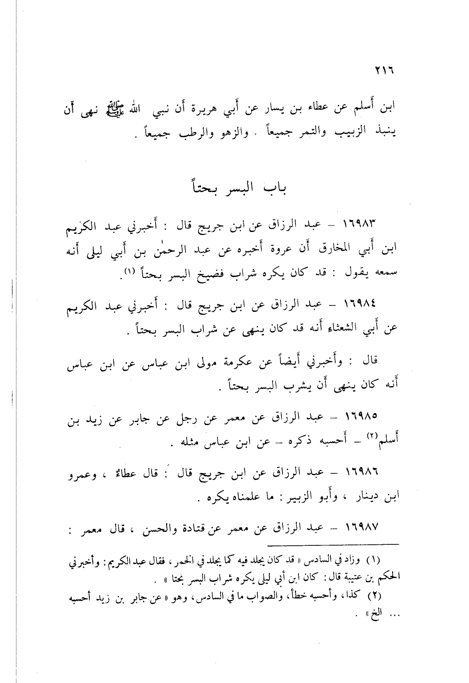 16984 - عَنِ ابْنِ جُرَيْجٍ قَالَ: أَخْبَرَنِي عَبْدُ الْكَرِيمِ، عَنْ أَبِي الشَّعْثَاءِ أَنَّهُ قَدْ كَانَ §يُنَهَى عَنْ شَرَابِ الْبُسْرِ، بَحْتًا "