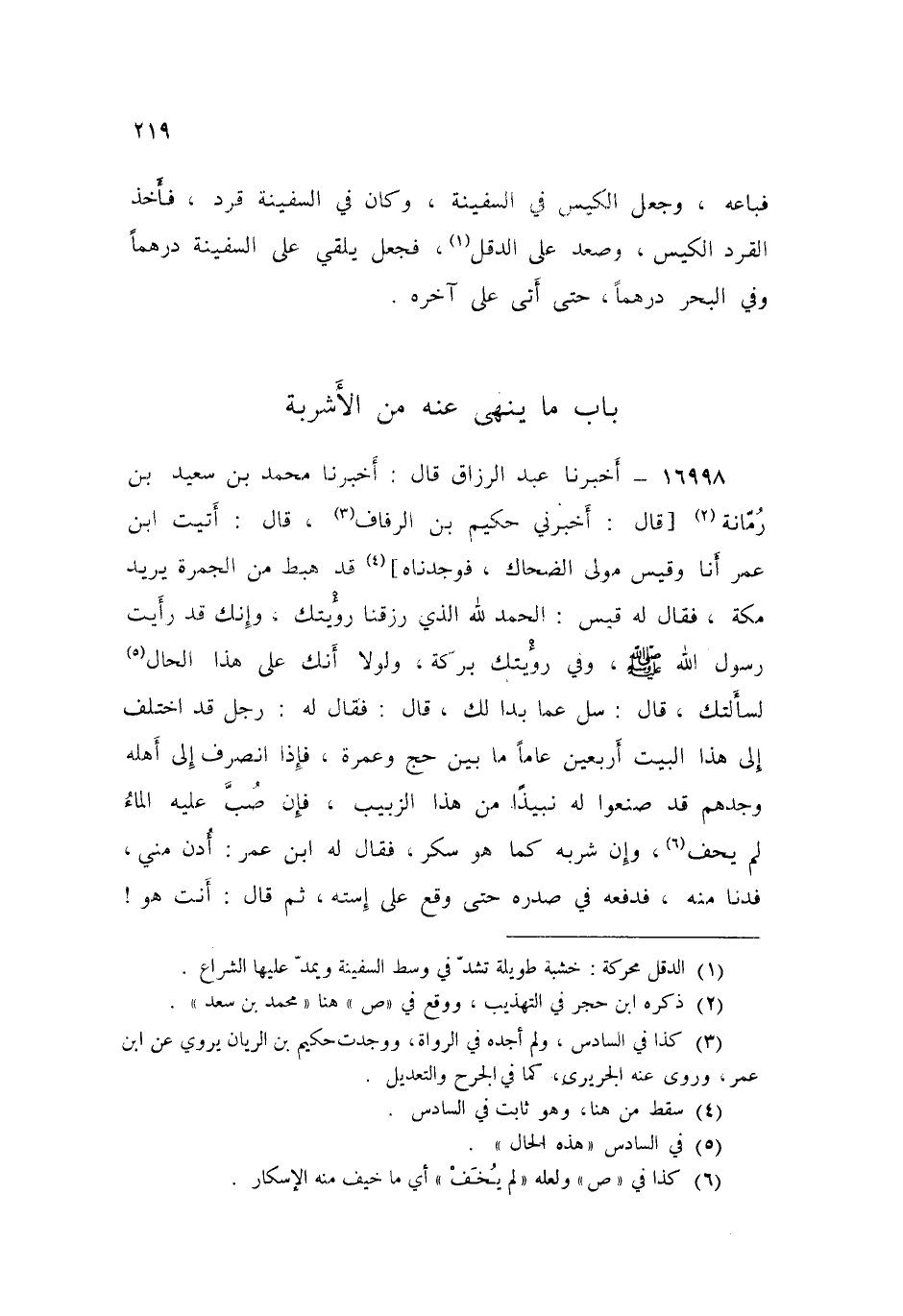 16998 - عَبْدُ الرَّزَّاقِ قَالَ: أَخْبَرَنَا مُحَمَّدُ بْنُ سَعِيدِ بْنِ رُمَّانَةَ قَالَ: أَخْبَرَنِي حَكِيمُ بْنُ الرَّفَافِ قَالَ: أَتَيْتُ ابْنَ عُمَرَ أَنَا وَقَيْسُ، مَوْلَى الضَّحَّاكِ فَوَجَدْنَاهُ قَدْ هَبَطَ مِنَ الْجَمْرَةِ يُرِيدُ مَكَّةَ، فَقَالَ لَهُ قَيْسٌ: الْحَمْدُ لِلَّهِ الَّذِي رَزَقَنَا رُؤْيَتَكَ، وَإِنَّكَ قَدْ رَأَيْتَ رَسُولَ اللَّهِ صَلَّى اللهُ عَلَيْهِ وَسَلَّمَ وَفِي رُؤْيَتِكَ بَرَكَةٌ وَلَوَلَا أَنَّكَ عَلَى هَذَا الْحَالِ لَسَأَلْتُكَ قَالَ: سَلْ عَمَّا بَدَا لَكَ قَالَ: فَقَالَ لَهُ: §رَجُلٌ قَدِ اخْتَلَفَ إِلَى هَذَا الْبَيْتِ أَرْبَعِينَ عَامًا مَا بَيْنَ حَجٍّ وَعُمْرَةٍ، فَإِذَا انْصَرَفَ إِلَى أَهْلِهِ وَجَدَهُمْ قَدْ صَنَعُوا لَهُ نَبِيذًا مِنْ هَذَا الزَّبِيبِ، فَإِنْ صُبَّ عَلَيْهِ الْمَاءُ لَمْ يُحِفْ، وَإِنْ شَرِبَهُ كَمَا هُوَ سَكِرَ، فَقَالَ لَهُ: ابْنُ عُمَرَ: ادْنُ مِنِّي، فَدَنَا مِنْهُ فَدَفَعَهُ فِي صَدْرِهِ حَتَّى وَقَعَ عَلَى اسْتِهِ، ثُمَّ قَالَ: أَنْتَ هُوَ -[220]- فَلَا حَجَّ لَكَ وَلَا كَرَامَةَ، فَقَالَ: مَا سَأَلْتُكُ إِلَّا عَنْ نَفْسِي وَاللَّهِ لَا أَذُوقُ مِنْهُ قَطْرَةً أَبَدًا