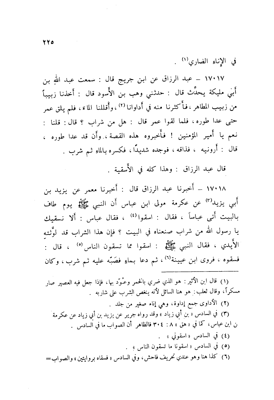 17018 - عَبْدُ الرَّزَّاقِ قَالَ: أَخْبَرَنَا مَعْمَرٌ، عَنْ يَزِيدَ بْنِ أَبِي يَزِيدَ، عَنْ عِكْرِمَةَ، مَوْلَى ابْنِ عَبَّاسٍ، أَنَّ النَّبِيَّ صَلَّى اللهُ عَلَيْهِ وَسَلَّمَ يَوْمَ طَافَ بِالْبَيْتِ أَتَى عَبَّاسًا فَقَالَ: اسْقُوا فَقَالَ عَبَّاسٌ: أَلَا نَسْقِيَكَ يَا رَسُولَ اللَّهِ مِنْ شَرَابٍ صَنَعْنَاهُ فِي الْبَيْتِ، فَإِنَّ هَذَا الشَّرَابَ قَدْ لَوَّثَتْهُ الْأَيْدِي، فَقَالَ النَّبِيُّ صَلَّى اللهُ عَلَيْهِ وَسَلَّمَ: «§اسْقُوا مِمَّا تَسْقُونَ النَّاسَ» قَالَ: فَسَقَوْهُ فَرَوَى ابْنُ عُيَيْنَةَ، ثُمَّ دَعَا بِمَاءٍ فَصَبَّهُ عَلَيْهِ، ثُمَّ شَرِبَ، وَكَانَ ذَلِكَ الشَّرَابُ فِي الْأَسْقِيَةِ "