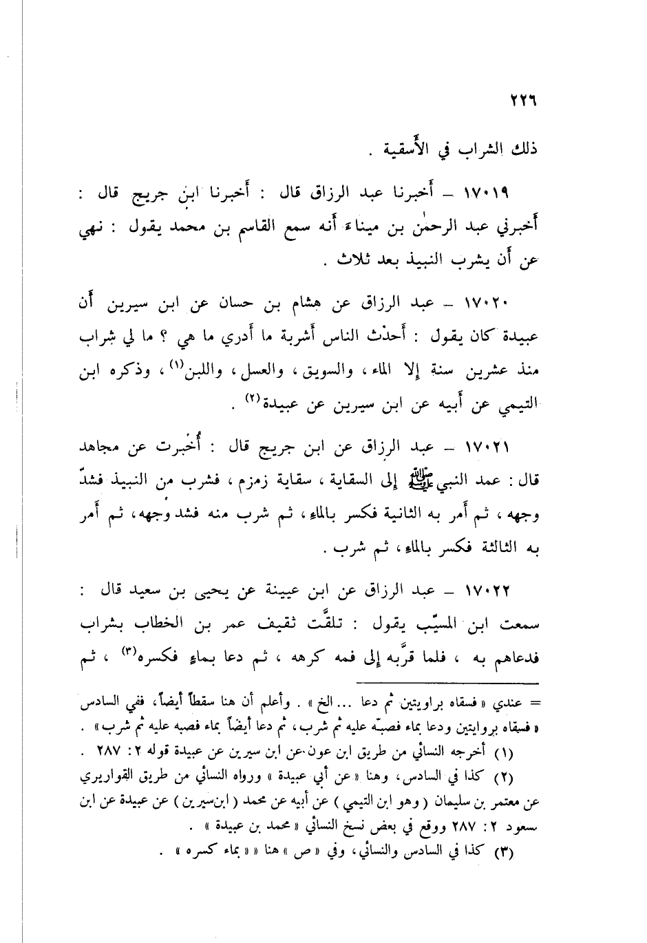 17021 - عَنِ ابْنِ جُرَيْجٍ قَالَ: أُخْبِرْتُ عَنْ مُجَاهِدٍ قَالَ: «§عَمِدَ النَّبِيُّ صَلَّى اللهُ عَلَيْهِ وَسَلَّمَ إِلَى السِّقَايَةِ سِقَايَةِ زَمْزَمَ، فَشَرِبَ مِنَ النَّبِيذِ، فَشَدَّ وَجْهَهُ، ثُمَّ أَمَرَ بِهِ الثَّانِيَةَ، فَكُسِرَ بِالْمَاءِ، ثُمَّ شَرِبَ مِنْهُ فَشَدَّ وَجْهَهُ، ثُمَّ أَمَرَ بِهِ الثَّالِثَةَ فَكُسِرَ بِالْمَاءِ، ثُمَّ شُرِبَ»