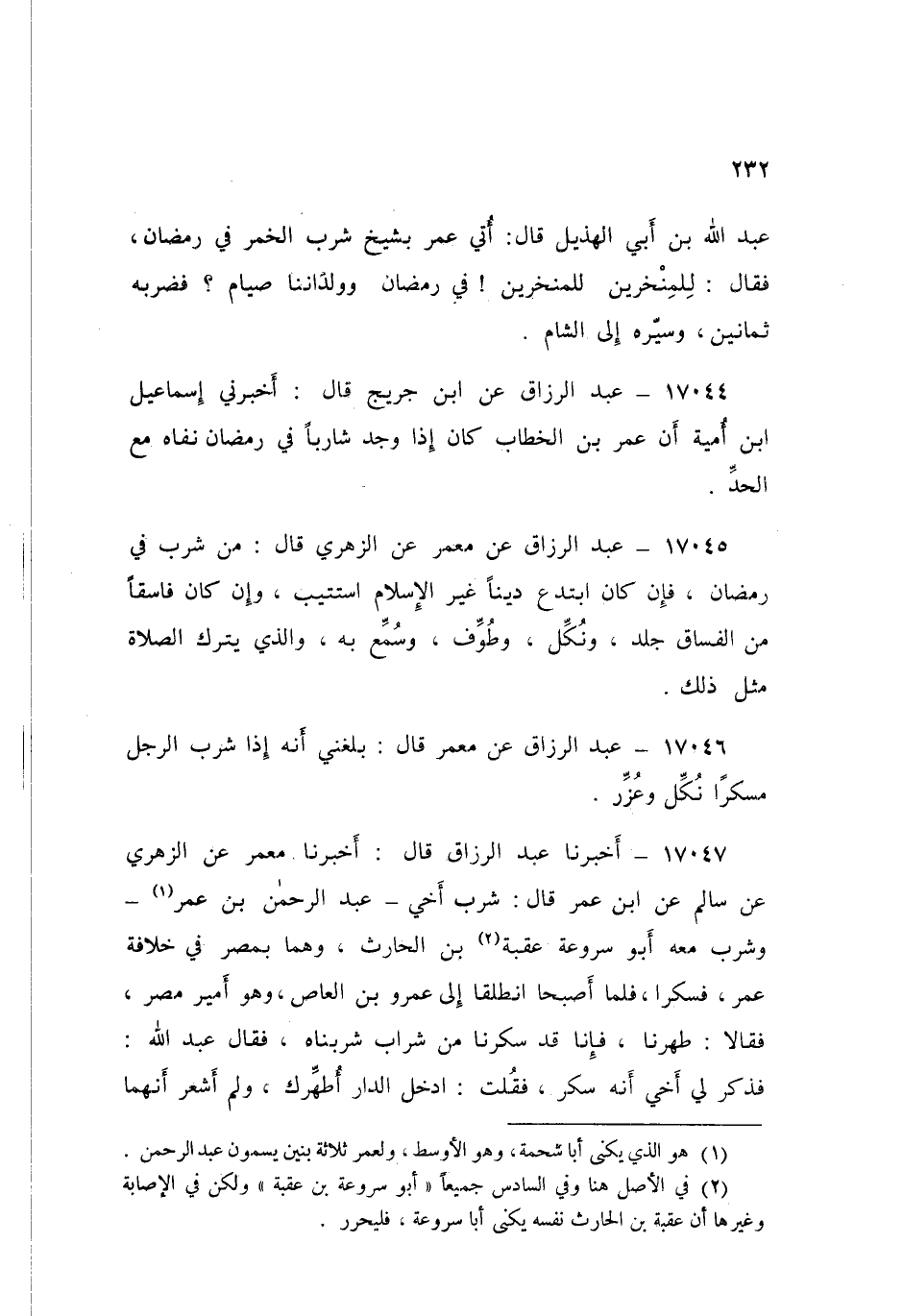 17047 - عَبْدُ الرَّزَّاقِ قَالَ: أَخْبَرَنَا مَعْمَرٌ، عَنِ الزُّهْرِيِّ، عَنْ سَالِمٍ، عَنِ ابْنِ عُمَرَ قَالَ: «§شَرِبَ أَخِي عَبْدُ الرَّحْمَنِ بْنُ عُمَرَ، وَشَرِبَ مَعَهُ أَبُو سِرْوَعَةَ عُقْبَةُ بْنُ الْحَارِثِ، وَهُمَا بِمِصْرَ فِي خِلَافَةِ عُمَرَ فَسَكِرَا، فَلَمَّا أَصْبَحَا انْطَلَقَا إِلَى عَمْرِو بْنِ الْعَاصِ، وَهُوَ أَمِيرُ مِصْرَ» فَقَالَا: طَهِّرْنَا فَإِنَّا قَدْ سَكِرْنَا مِنْ شَرَابٍ شَرِبْنَاهُ، فَقَالَ عَبْدُ اللَّهِ: فَذَكَرَ لِي أَخِي أَنَّهُ سَكِرَ فَقُلْتُ: ادْخُلِ الدَّارَ أُطَهِّرْكَ، وَلَمْ أَشْعُرْ أَنَّهُمْا -[233]- أَتَيَا عَمْرًا فَأَخْبَرَنِي أَخِي أَنَّهُ قَدْ أَخْبَرَ الْأَمِيرَ بِذَلِكَ، فَقَالَ عَبْدُ اللَّهِ: «لَا يَحْلِقُ الْقَوْمُ عَلَى رُءوسِ النَّاسِ ادْخُلِ الدَّارَ أَحْلِقْكَ، وَكَانُوا إِذْ ذَاكَ يَحْلِقُونَ مَعَ الْحُدُودِ فَدَخَلَ الدَّارَ»، فَقَالَ عَبْدُ اللَّهِ: فَحَلَقْتُ أَخِي بِيَدِي، ثُمَّ جَلَدَهُمْ عَمْرٌو فَسَمِعَ بِذَلِكَ عُمَرُ فَكَتَبَ إِلَى عَمْرٍو أَنِ ابْعِثْ إِلَيَّ بِعَبْدِ الرَّحْمَنِ عَلَى قَتَبٍ فَفَعَلَ ذَلِكَ، فَلَمَّا قَدِمَ عَلَى عُمَرَ جَلَدَهُ، وَعَاقَبَهُ لِمَكَانِهِ مِنْهُ، ثُمَّ أَرْسَلَهُ فَلِبَثَ شَهْرًا صَحِيحًا، ثُمَّ أَصَابَهُ قَدَرُهُ فَمَاتَ فَيَحْسِبُ عَامَّةُ النَّاسِ أَنَّمَا مَاتَ مِنْ جَلْدِ عُمَرَ وَلَمْ يَمُتْ مِنْ جَلْدِ عُمَرَ