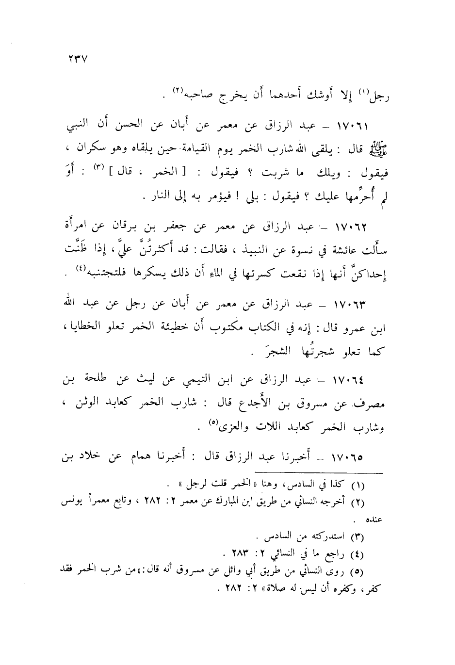 17063 - عَنْ مَعْمَرٍ، عَنْ أَبَانَ، عَنْ رَجُلٍ، عَنْ عَبْدِ اللَّهِ بْنِ عَمْرٍو قَالَ: «إِنَّهُ §فِي الْكِتَابِ مَكْتُوبٌ أَنَّ خَطِيئَةَ الْخَمْرِ تَعْلُو الْخَطَايَا كَمَا تَعْلُو شَجَرَتُهَا الشَّجَرَ»