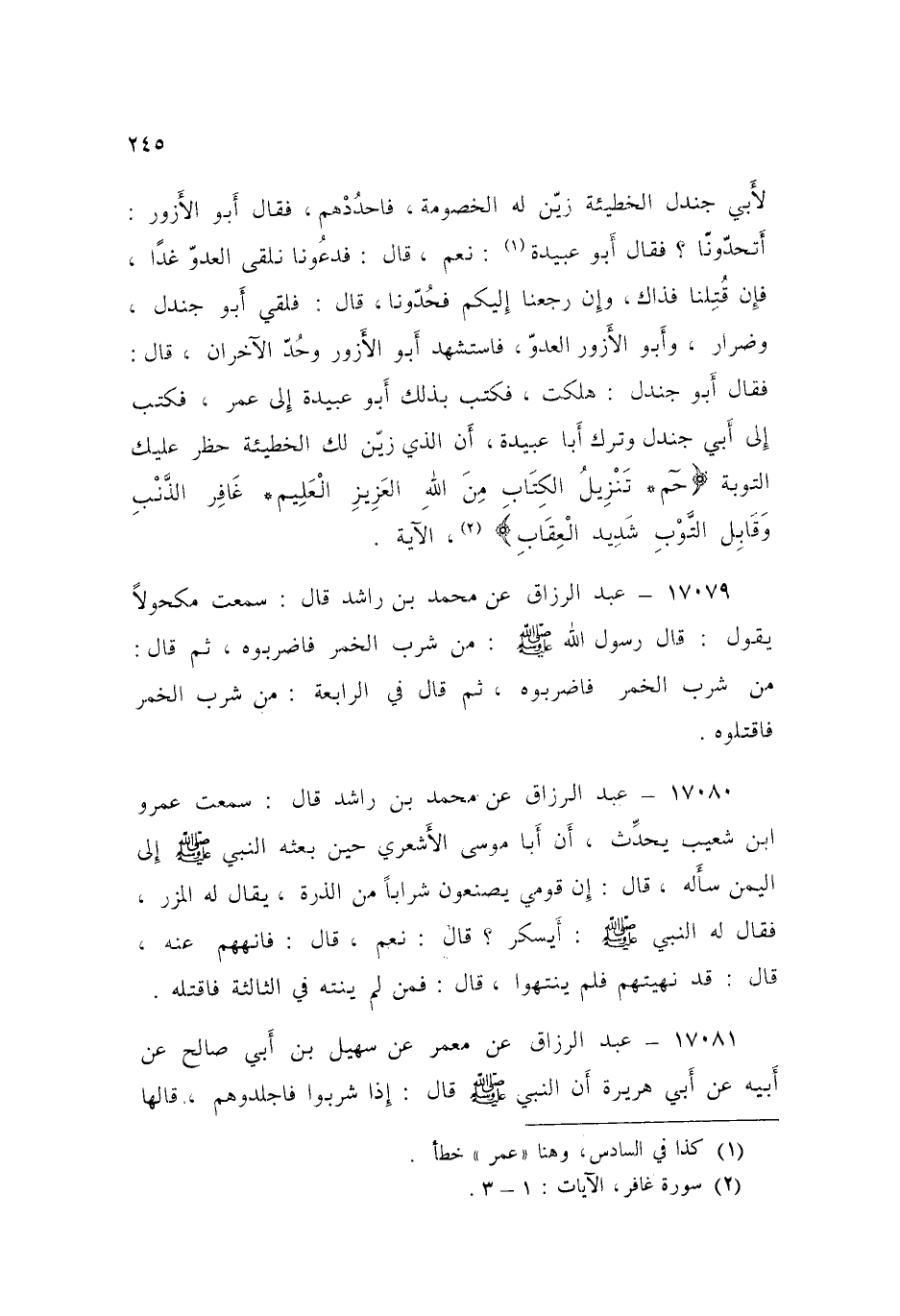 17082 - عَنْ مَعْمَرٍ، عَنْ زَيْدِ بْنِ أَسْلَمَ قَالَ: أُتِيَ بِابْنِ النُّعَيْمَانِ إِلَى النَّبِيِّ صَلَّى اللهُ عَلَيْهِ وَسَلَّمَ فَجَلَدَهُ، ثُمَّ أُتِيَ بِهِ فَجَلَدَهُ قَالَ: «مِرَارًا أَرْبَعًا أَوْ خَمْسًا» فَقَالَ رَجُلٌ: اللَّهُمَّ الْعَنْهُ، مَا أَكْثَرُ مَا يَشْرَبُ، وَمَا أَكْثَرُ مَا يُجْلَدُ، فَقَالَ النَّبِيُّ صَلَّى اللهُ عَلَيْهِ وَسَلَّمَ: «§لَا تَلْعَنْهُ فَإِنَّهُ يُحِبُّ اللَّهَ وَرَسُولَهُ»