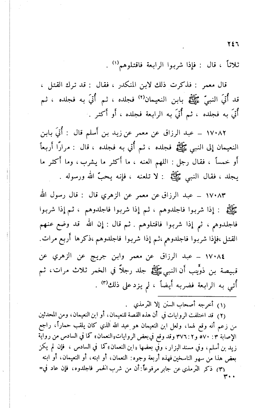 17085 - عَنِ ابْنِ جُرَيْجٍ، عَنْ عَمْرِو بْنِ دِينَارٍ، إِنَّ النَّبِيَّ صَلَّى اللهُ عَلَيْهِ وَسَلَّمَ قَالَ: «§مَنْ شَرِبَ الْخَمْرَ، فَحُدُّوهُ فَإِنْ شَرِبَ الثَّانِيَةَ، فَحُدُّوهُ فَإِنْ شَرِبَ الثَّالِثَةَ، فَحُدُّوهُ فَإِنْ شَرِبَ الرَّابِعَةَ، فَاقْتُلُوهُ» قَالَ: فَأُتِيَ بِابْنِ النُّعَيْمَانِ قَدْ شَرِبَ فَضُرِبَ بِالنِّعَالِ وَالْأَيْدِي، ثُمَّ أُتِيَ بِهِ الثَّانِيَةَ فَكَذَلِكَ، ثُمَّ أُتِيَ بِهِ الثَّالِثَةَ فَكَذَلِكَ، ثُمَّ أُتِيَ بِهِ الرَّابِعَةَ، فَحَدَّهُ وَوَضَعَ الْقَتْلَ