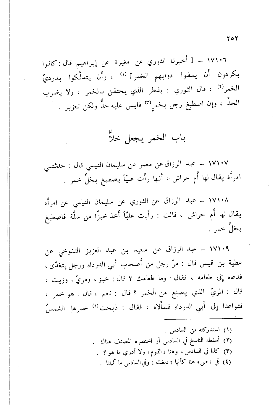 17107 - عَنْ مَعْمَرٍ، عَنْ سُلَيْمَانَ التَّيْمِيِّ قَالَ: حُدِّثْتُنِي امْرَأَةٌ يُقَالُ لَهَا أُمُّ حِرَاشٍ أَنَّهَا رَأَتْ عَلِيًّا §يَصْطَبِغُ بِخَلِّ خَمْرٍ "