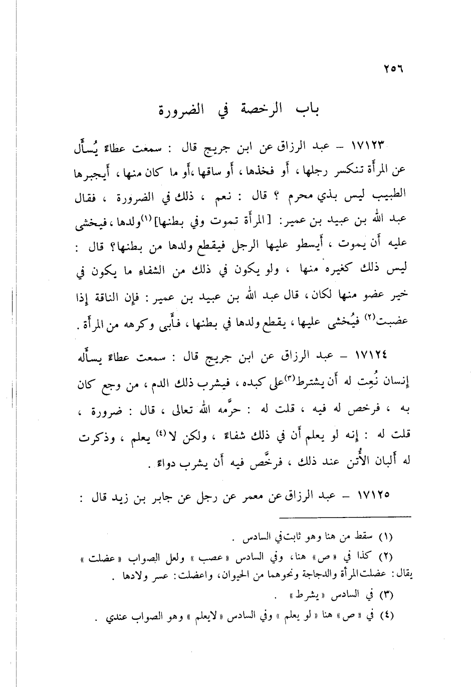 17123 - عَنِ ابْنِ جُرَيْجٍ قَالَ: سَمِعْتُ عَطَاءً، يُسْأَلُ عَنِ الْمَرْأَةِ تَنْكَسِرُ رِجْلُهَا أَوْ فَخِذُهَا أَوْ سَاقُهَا أَوْ مَا كَانَ مِنْهَا §أَيَجْبِرُهَا الطَّبِيبُ لَيْسَ بِذِي مَحْرَمٍ؟ قَالَ: «نَعَمْ، ذَلِكَ فِي الضَّرُورَةِ» فَقَالَ عَبْدُ اللَّهِ بْنُ عُبَيْدِ بْنِ عُمَيْرٍ: الْمَرْأَةُ تَمُوتُ وَفِي بَطْنِهَا وَلَدُهَا، فَيُخْشَى عَلَيْهِ أِنْ يَمُوتَ أَيَسْطُو عَلَيْهَا الرَّجُلُ فَيَقْطَعُ وَلَدَهَا مِنْ بَطْنِهَا؟ قَالَ: «لَيْسَ ذَلِكَ كَغَيْرِهِ مِنْهَا، وَلَوْ يَكُونُ فِي ذَلِكَ مِنَ الشِّفَاءِ مَا يَكُونُ فِي خَيْرِ عُضْوٍ مِنْهَا لَكَانَ» قَالَ عَبْدُ اللَّهِ بْنُ عُبَيْدِ بْنِ عُمَيْرٍ: فَإِنَّ النَّاقَةَ إِذَا عَضِبَتْ فَيُخْشَى عَلَيْهَا يُقْطَعُ وَلَدُهَا فِي بَطْنِهَا فَأَبَى وَكَرِهَهُ مِنَ الْمَرْأَةِ "