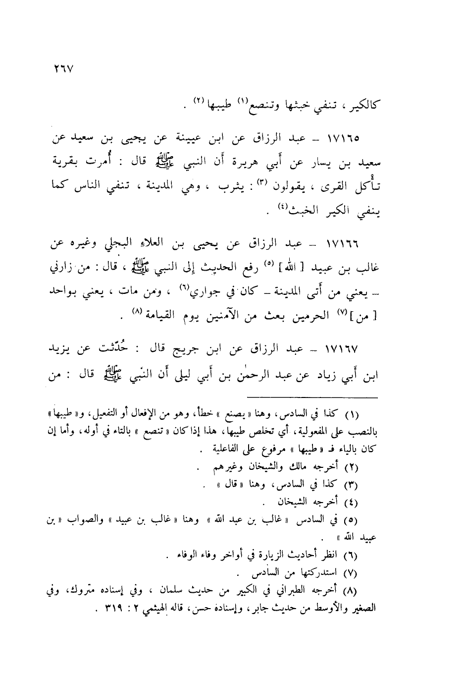 17167 - عَنِ ابْنِ جُرَيْجٍ قَالَ: حُدِّثْتُ عَنْ يَزِيدَ بْنِ أَبِي زِيَادٍ، عَنْ عَبْدِ الرَّحْمَنِ بْنِ أَبِي لَيْلَى، أَنَّ النَّبِيَّ صَلَّى اللهُ عَلَيْهِ وَسَلَّمَ قَالَ: §مَنْ قَالَ لِلْمَدِينَةِ يَثْرِبُ فَلْيَقُلْ: أَسْتَغْفِرُ اللَّهَ ثَلَاثًا هِيَ طِيبَةٌ هِيَ طِيبَةٌ هِيَ طِيبَةٌ "، أَخْبَرَنَا