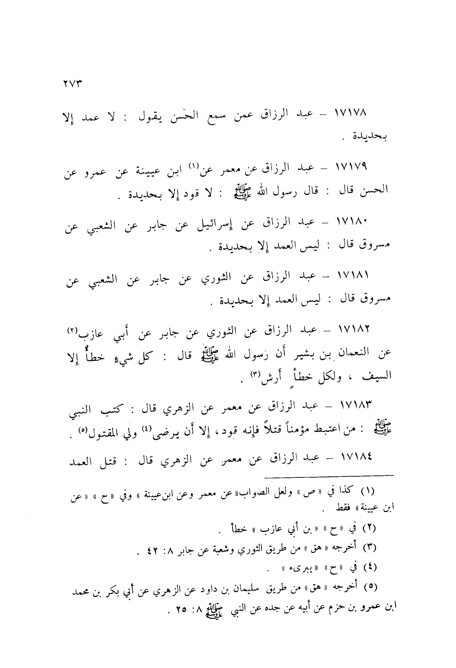 17180 - عَبْدُ الرَّزَّاقِ، عَنْ إِسْرَائِيلَ، عَنْ جَابِرٍ، عَنِ الشَّعْبِيِّ، عَنْ مَسْرُوقٍ قَالَ: «§لَيْسَ الْعَمْدُ إِلَّا بِحَدِيدَةٍ»