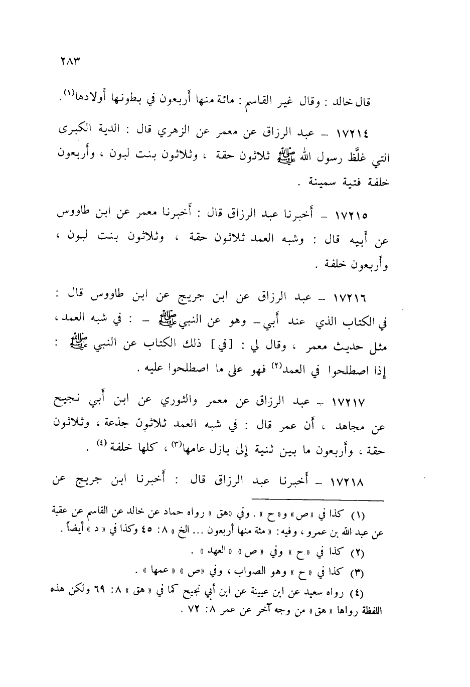 17215 - عَبْدُ الرَّزَّاقِ قَالَ: أَخْبَرَنَا مَعْمَرٌ، عَنِ ابْنِ طَاوُسٍ، عَنْ أَبِيهِ قَالَ: «§وَشِبْهُ الْعَمْدِ ثَلَاثُونَ حِقَّةً وَثَلَاثُونَ بِنْتَ لَبُونٍ وَأَرْبَعُونَ خَلِفَةً»