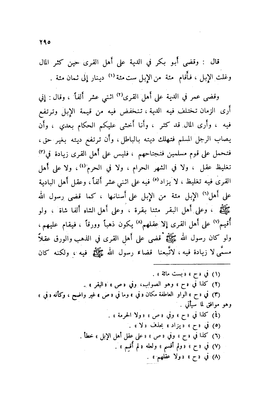 قَالَ: «وَقَضَى أَبُو بَكْرٍ فِي الدِّيَةِ عَلَى أَهْلِ الْقُرَى حِينَ كَثُرَ الْمَالُ، وَغَلَتِ الْإِبِلُ §فَأَقَامَ مِائَةً مِنَ الْإِبِلِ سِتَّمِائَةِ دِينَارٍ إِلَى ثَمَانِمِائَةٍ»