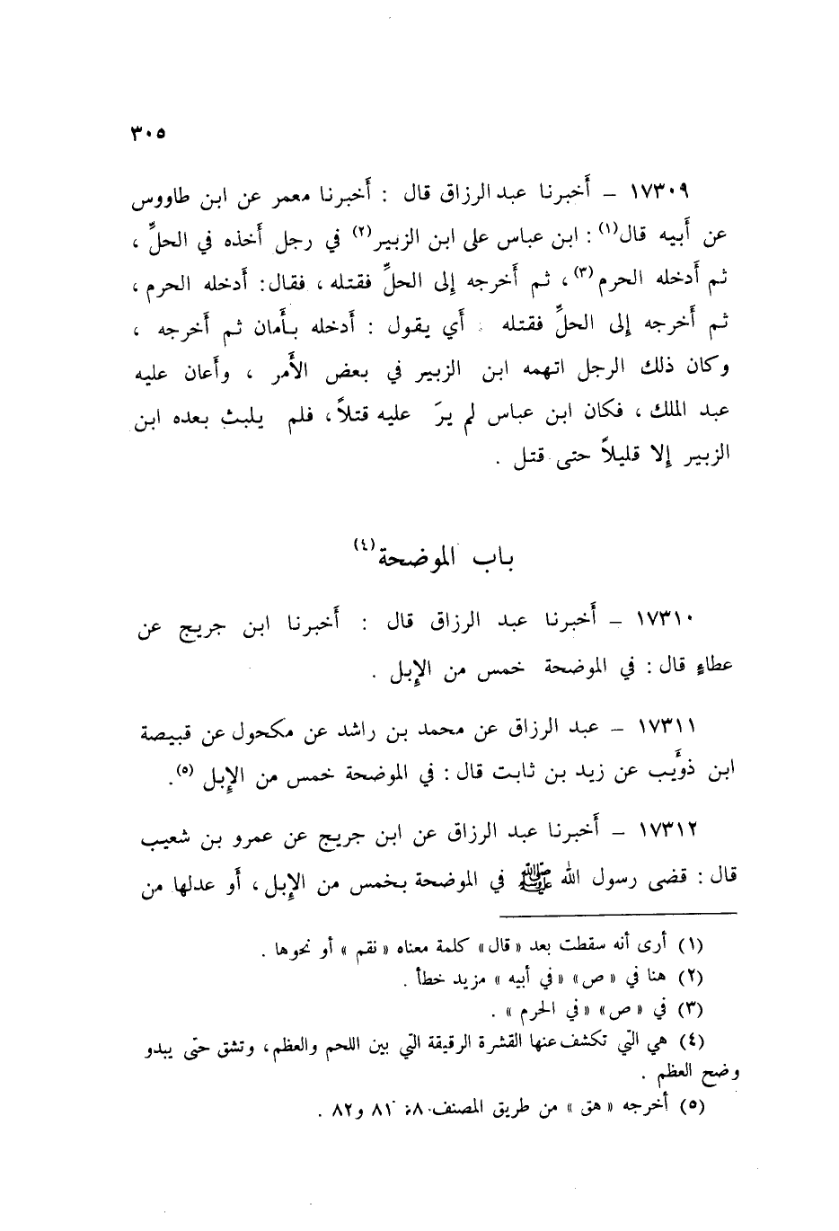 17310 - عَبْدُ الرَّزَّاقِ قَالَ: أَخْبَرَنَا ابْنُ جُرَيْجٍ، عَنْ عَطَاءٍ قَالَ: «§فِي الْمُوضِحَةِ خَمْسٌ مِنَ الْإِبِلِ»