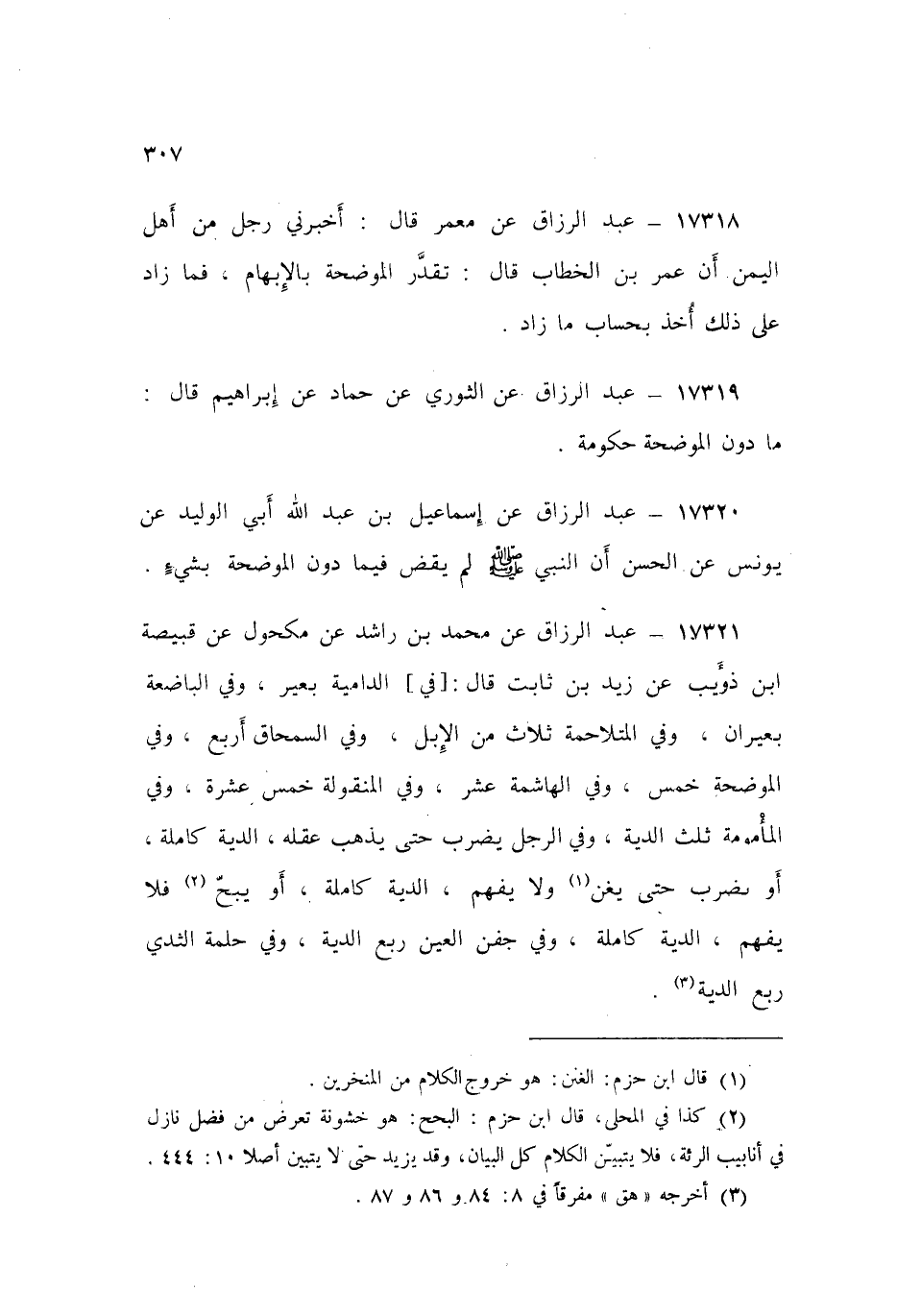 17321 - عَنْ مُحَمَّدِ بْنِ رَاشِدٍ، عَنْ مَكْحُولٍ، عَنْ قَبِيصَةَ بْنِ ذُؤَيْبٍ، عَنْ زَيْدِ بْنِ ثَابِتٍ قَالَ: «فِي §الدَّامِيَةِ بَعِيرٌ، وَفِي الْبَاضِعَةِ بَعِيرَانِ، وَفِي الْمُتَلَاحِمَةِ ثَلَاثٌ مِنَ الْإِبِلِ، وَفِي السَّمْحَاقِ أَرْبَعٌ، وَفِي الْمُوضِحَةِ خَمْسٌ، وَفِي الْهَاشِمَةِ عَشْرٌ، وَفِي الْمَنْقُولَةِ خَمْسَ عَشْرَةَ، وَفِي الْمَأْمُومَةِ ثُلُثُ الدِّيَةِ، وَفِي الرَّجُلِ يُضْرَبُ حَتَّى يَذْهَبَ عَقْلُهُ الدِّيَةُ كَامِلَةٌ أَوْ يضُرِبَ حَتَّى يَغَنَّ، وَلَا يَفْهَمَ الدِّيَةُ كَامِلَةٌ أَوْ يَبَحَّ فَلَا يَفْهَمَ الدِّيَةُ كَامِلَةٌ، وَفِي جَفْنِ الْعَيْنِ رُبُعُ الدِّيَةِ، وَفِي حَلَمَةُ الثَّدْيِ رُبُعُ الدِّيَةِ»
