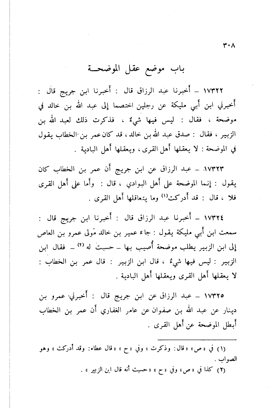 17324 - عَبْدُ الرَّزَّاقِ قَالَ: أَخْبَرَنَا ابْنُ جُرَيْجٍ قَالَ: سَمِعْتُ ابْنَ أَبِي مُلَيْكَةَ يَقُولُ: جَاءَ عُمَيْرُ بْنُ خَالِدٍ مَوْلَى عَمْرِو بْنِ الْعَاصِ إِلَى ابْنِ الزُّبَيْرِ يَطْلُبُ مُوضِحَةً أُصِيبَ بِهَا حَسِبْتُ لَهُ، فَقَالَ ابْنُ الزُّبَيْرِ: لَيْسَ فِيهَا شَيْءٌ قَالَ ابْنُ الزُّبَيْرِ: قَالَ عُمَرُ بْنُ الْخَطَّابِ: «§لَا يَعْقِلُهَا أَهْلُ الْقُرَى وَيَعْقِلُهَا أَهْلُ الْبَادِيَةِ»