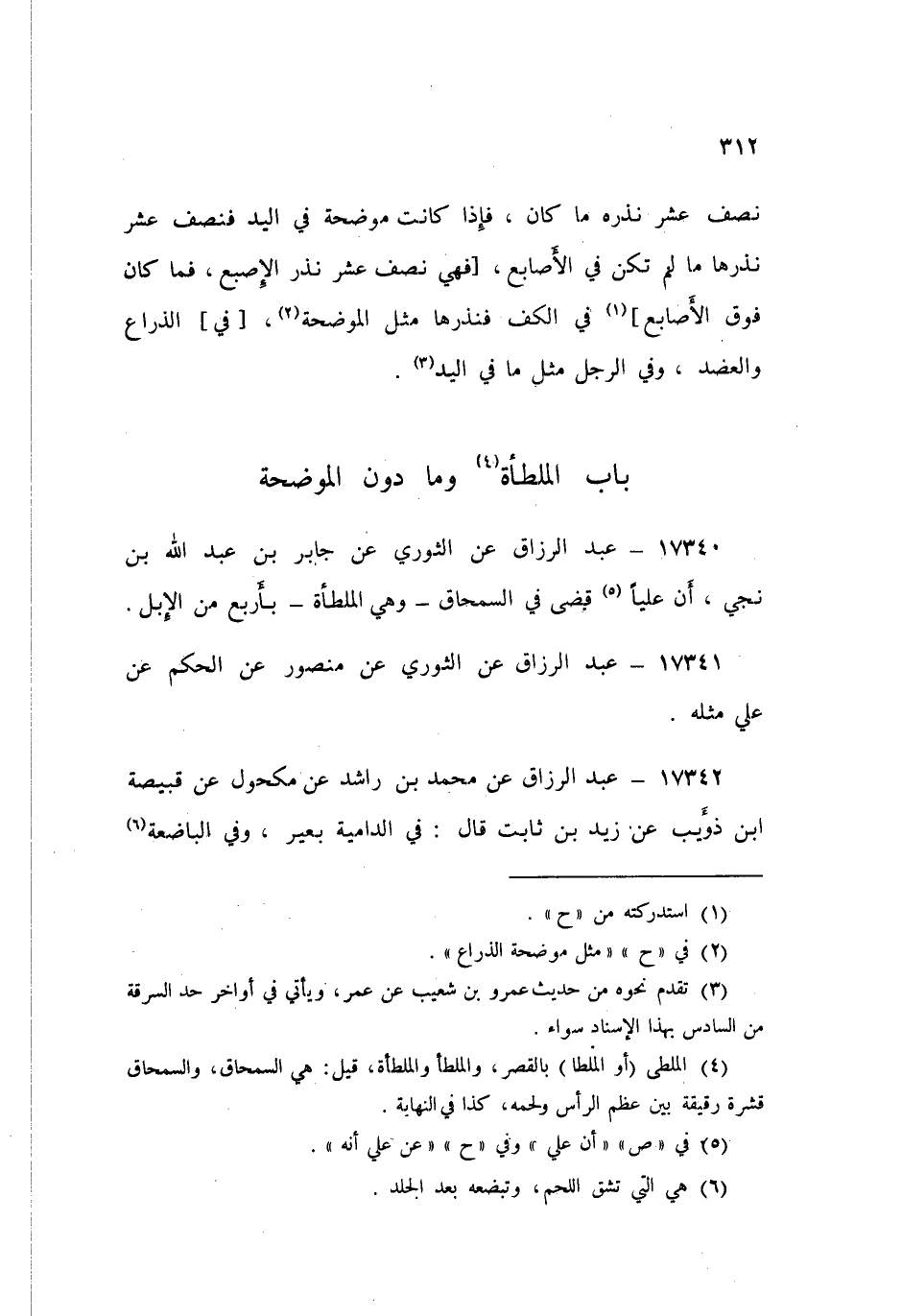 17342 - عَنْ مُحَمَّدِ بْنِ رَاشِدٍ، عَنْ مَكْحُولٍ، عَنْ قَبِيصَةَ بْنِ ذُؤَيْبٍ، عَنْ زَيْدِ بْنِ ثَابِتٍ قَالَ: «§فِي الدَّامِيَةِ بَعِيرٌ، وَفِي الْبَاضِعَةِ بَعِيرَانِ، وَفِي الْمُتَلَاحِمَةِ ثَلَاثٌ، وَفِي السَّمْحَاقِ أَرْبَعٌ، وَفِي الْمُوضِحَةِ خَمْسٌ»، عَبْدُ الرَّزَّاقِ،