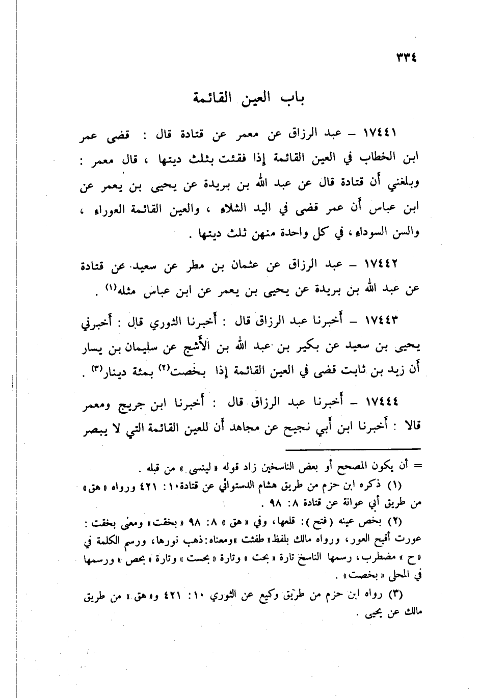 17441 - عَنْ مَعْمَرٍ، عَنْ قَتَادَةَ، قَالَ: «قَضَى عُمَرُ بْنُ الْخَطَّابِ §فِي الْعَيْنِ الْقَائِمَةِ، إِذَا فُقِئَتْ بِثُلُثِ دِيَتِهَا»